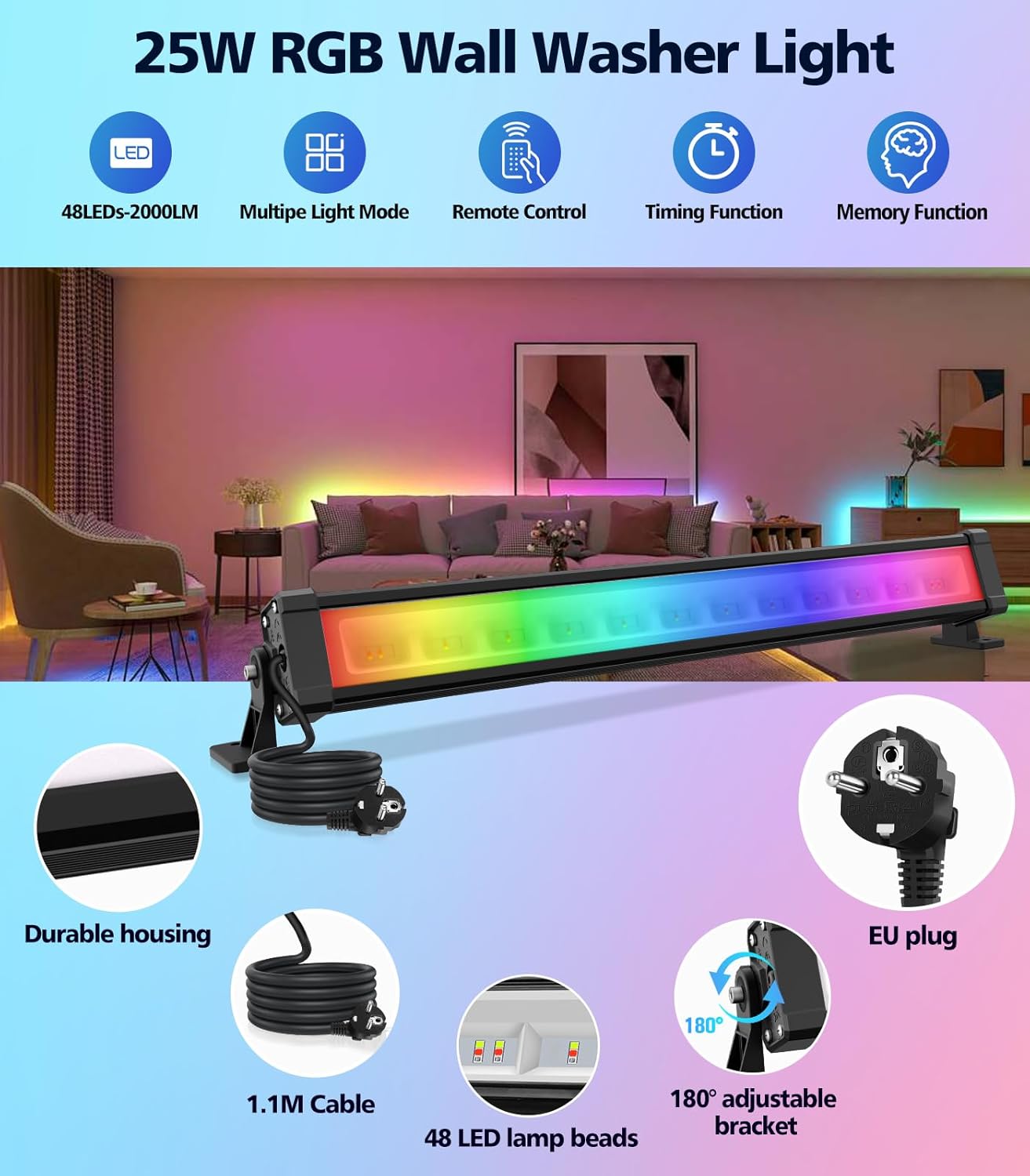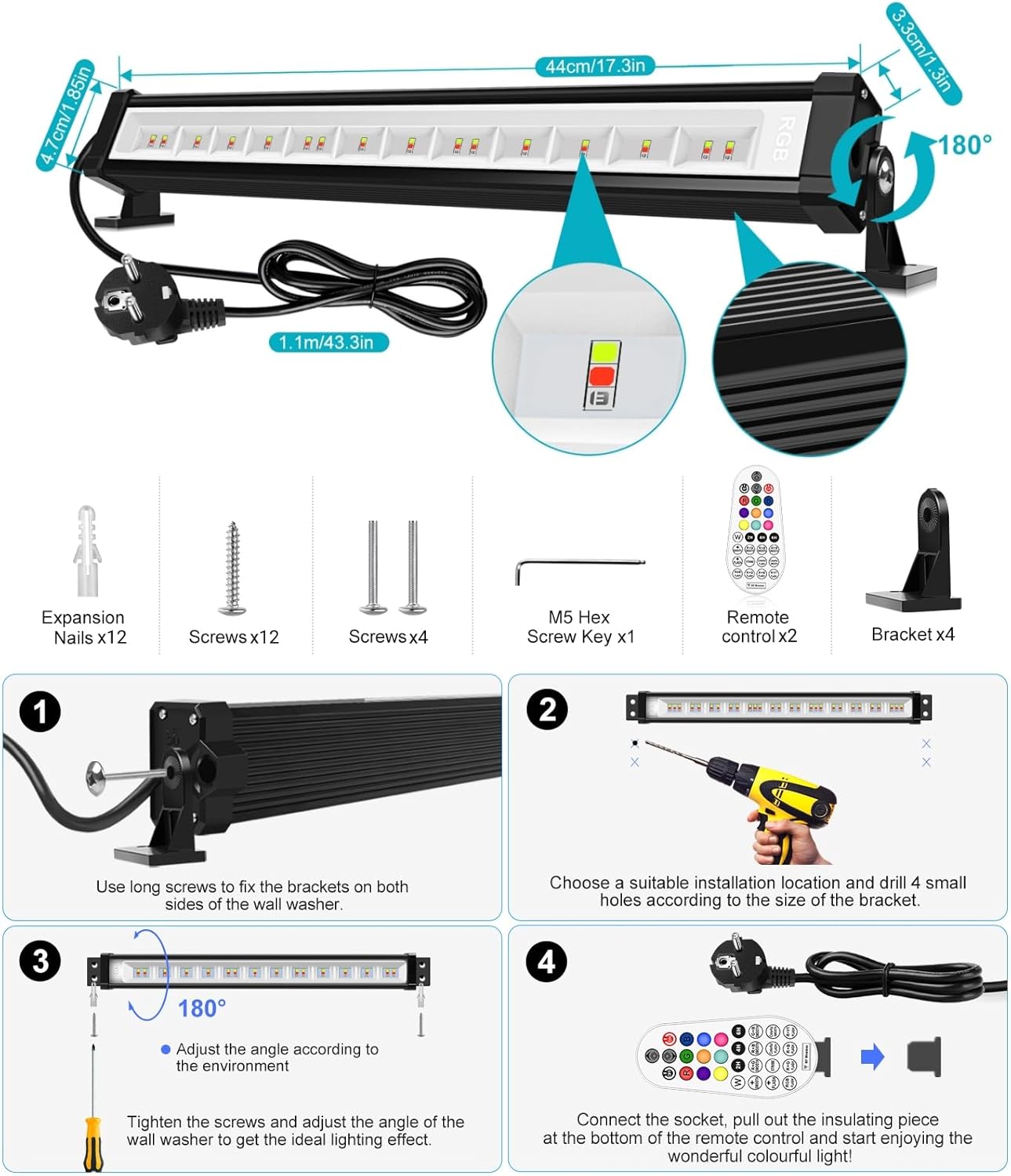 - 【12 Farben und 2 Modi】: Diese RGB-Wandfluter haben 12 verschiedene Farben und 2 Modi (Blitz, glatt). Sie sind sehr flexibel, um Ihren spezifischen Beleuchtungsanforderungen gerecht zu werden. Sie können verschiedene Farben oder Modi für verschiedene Szenen auswählen.