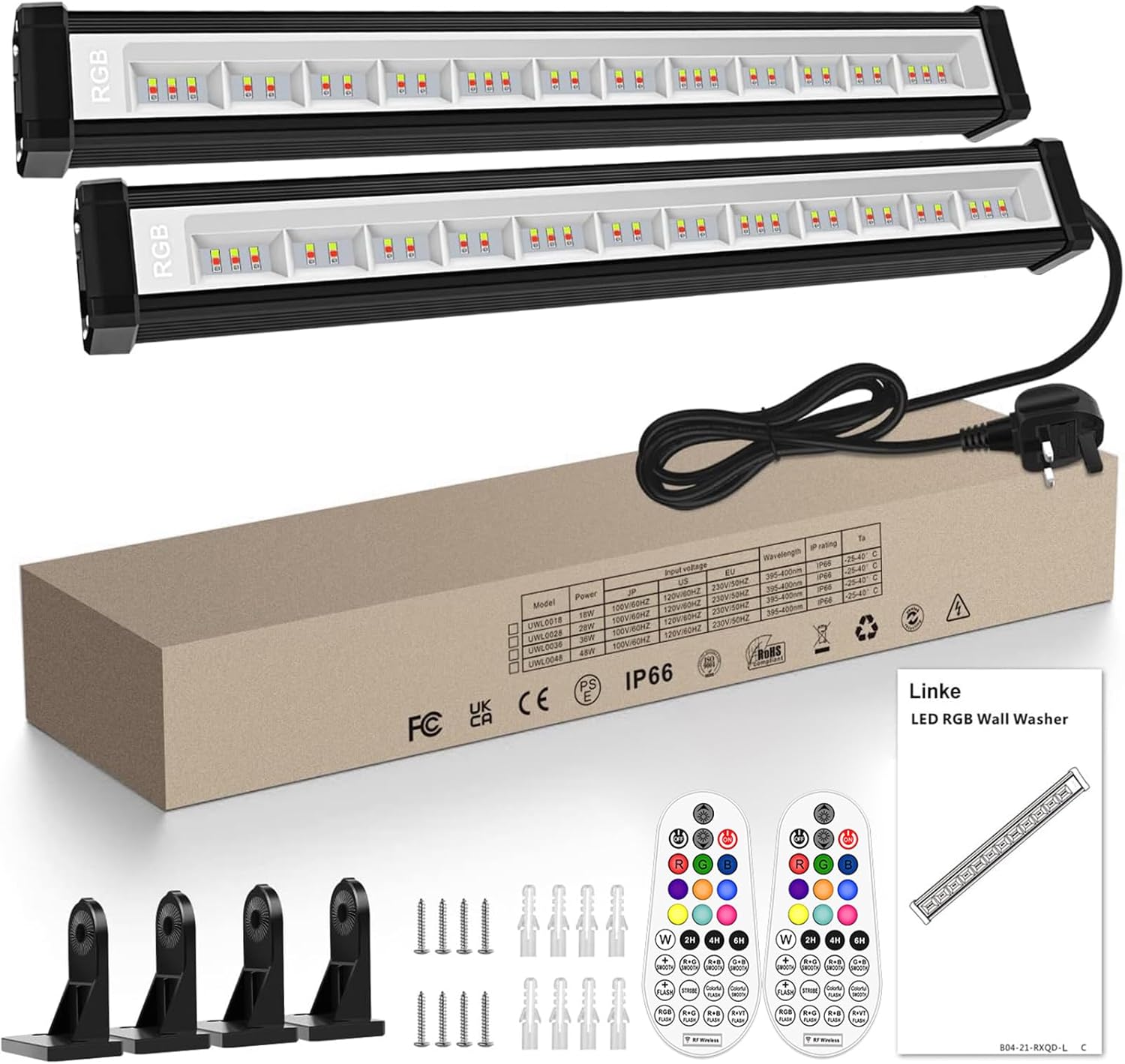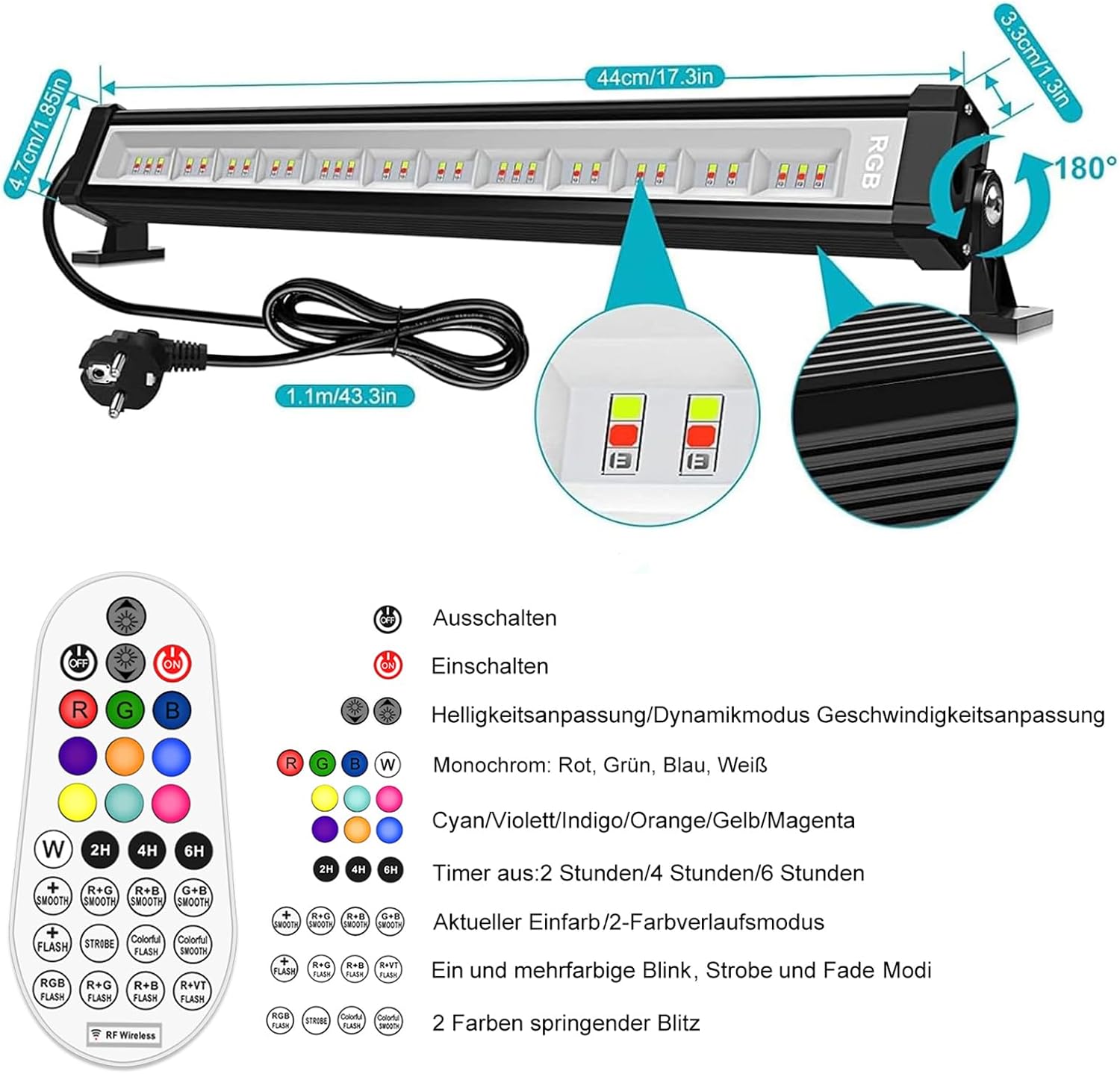 - 29-Tasten-Fernbedienung Wallwasher: Led strahler mit Fernbedienung, die einfach und bequem zu bedienen ist. Die Fernbedienung Abstand kann 12m, 360 ° erreichenSteuerungsbereich. Linke rgb wandleuchten können bis zu 3350 Lumen Beleuchtung liefern. Die Helligkeit kann über die Lichttasten für optimalen Sehkomfort nach oben und unten geregelt werden. Der Helligkeitsbereich: 25%-40%-55% -70%-85%-100%