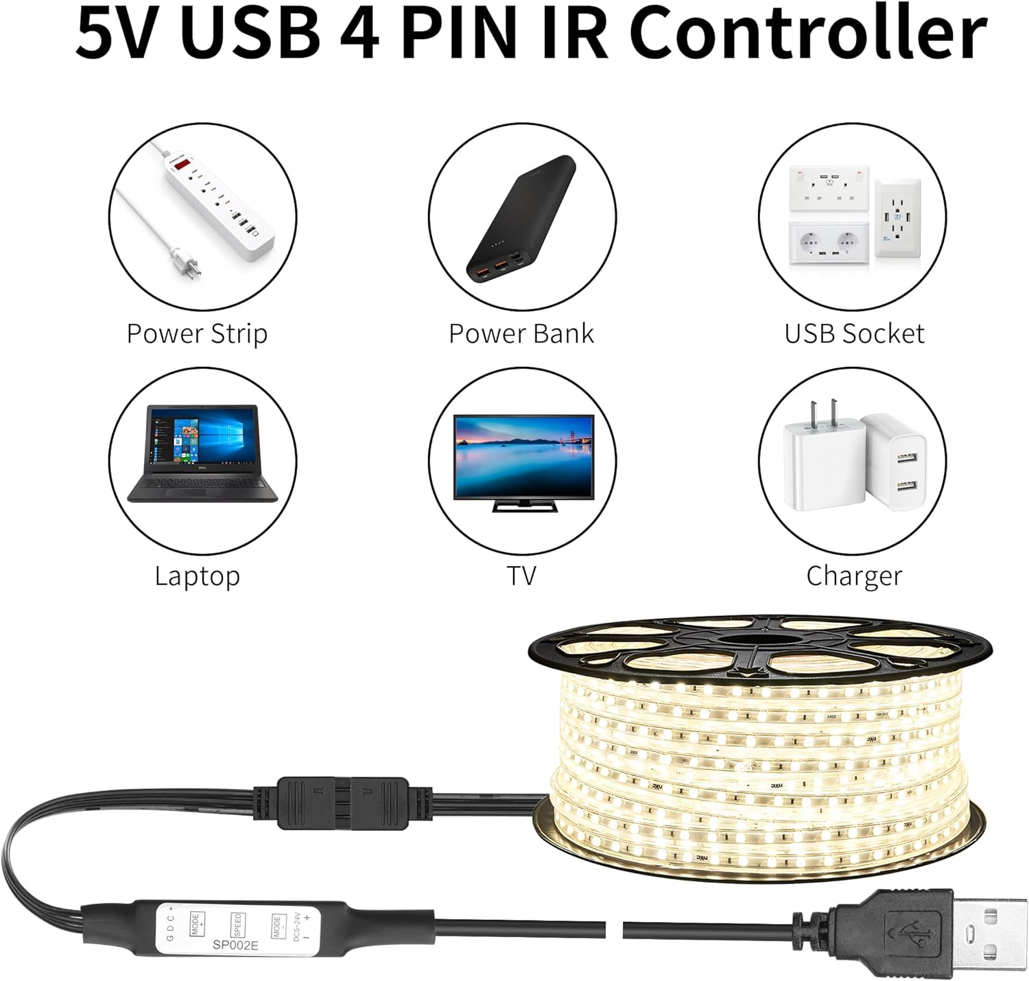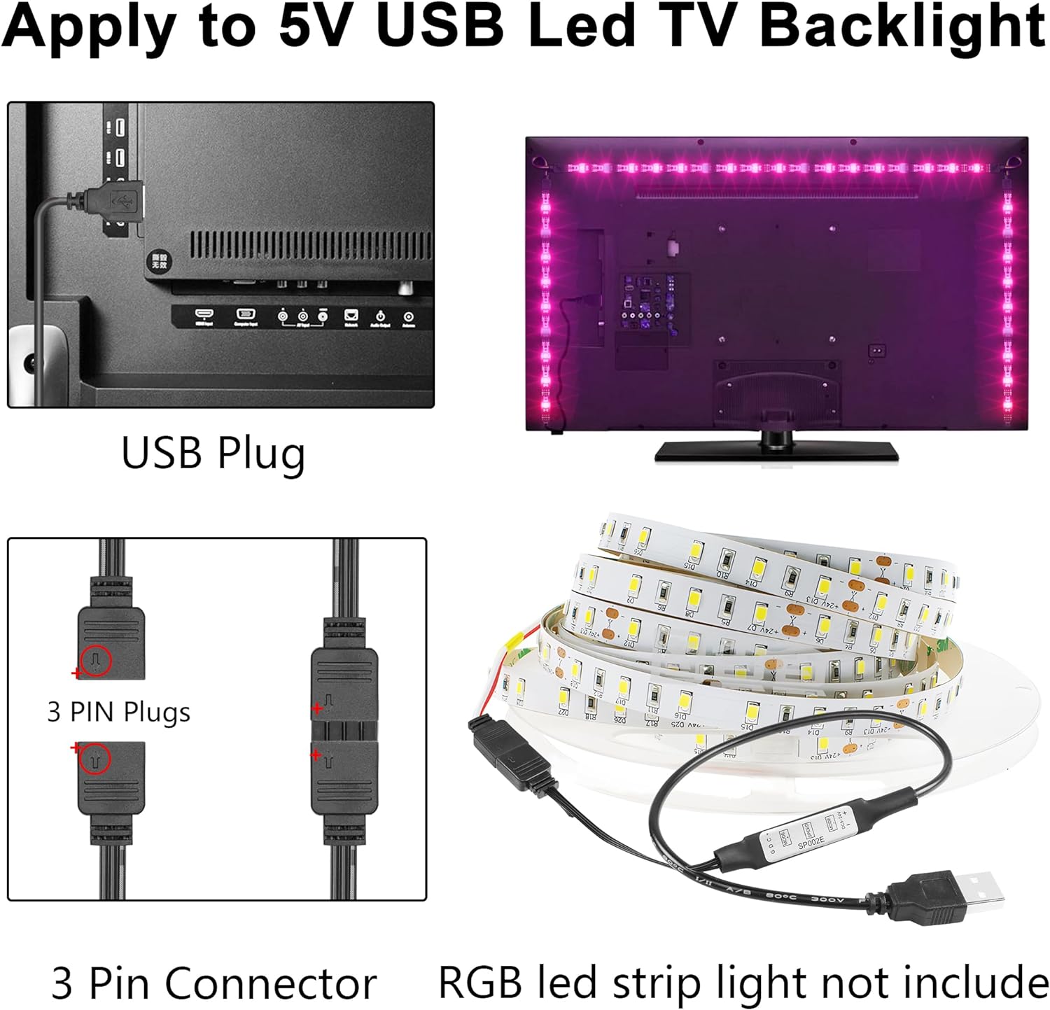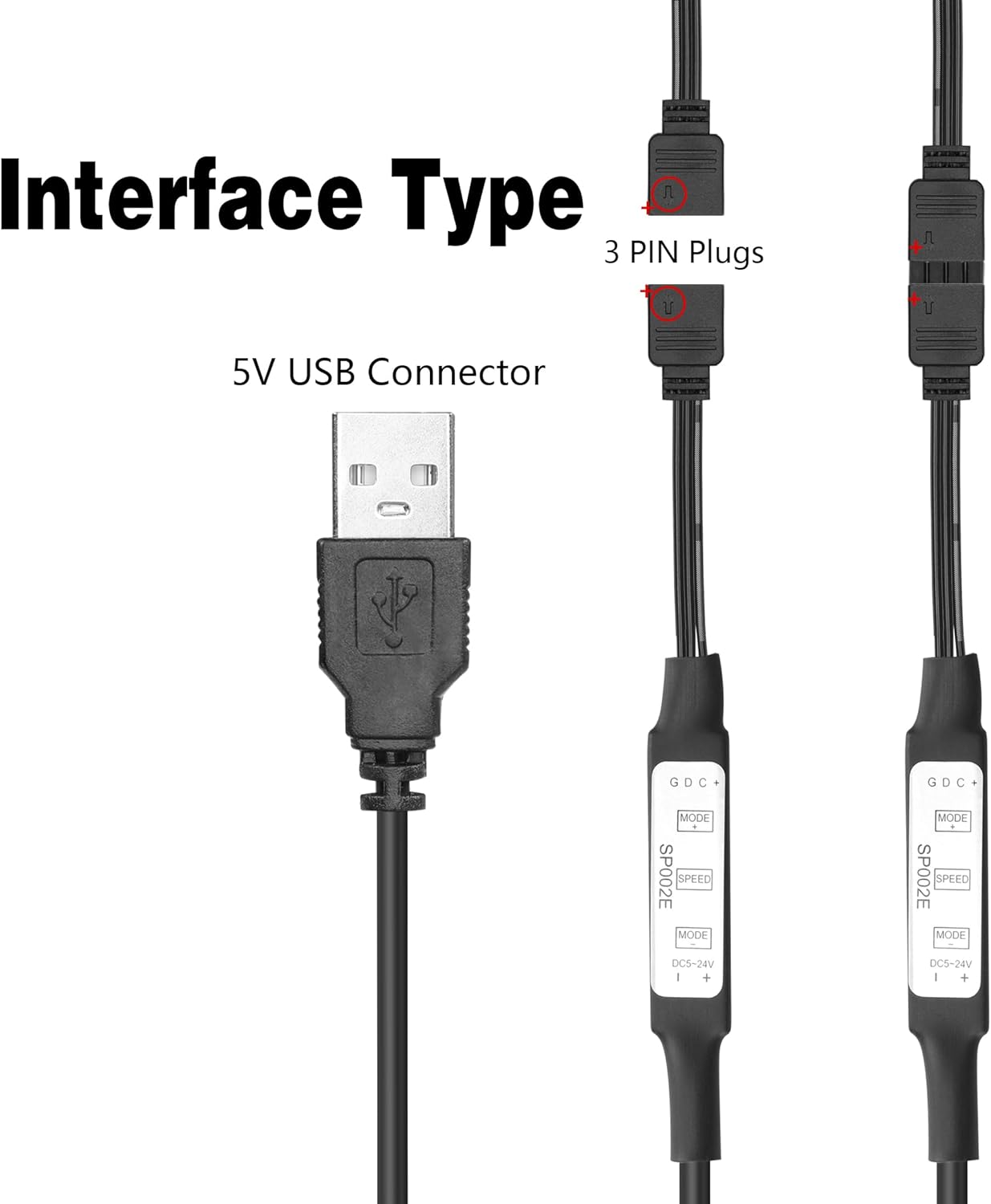 【Hinweis】Nur kompatibel mit 3-poligen 5-V-LED-Streifen und 5-V-USB-Netzteil. Der LED-Licht-Controller wird für 5-V-LED-Lichtstreifen verwendet und mit 5 V USB-Stromversorgungsgeräten betrieben; nicht geeignet für 12 V oder 24 V LED-Licht.