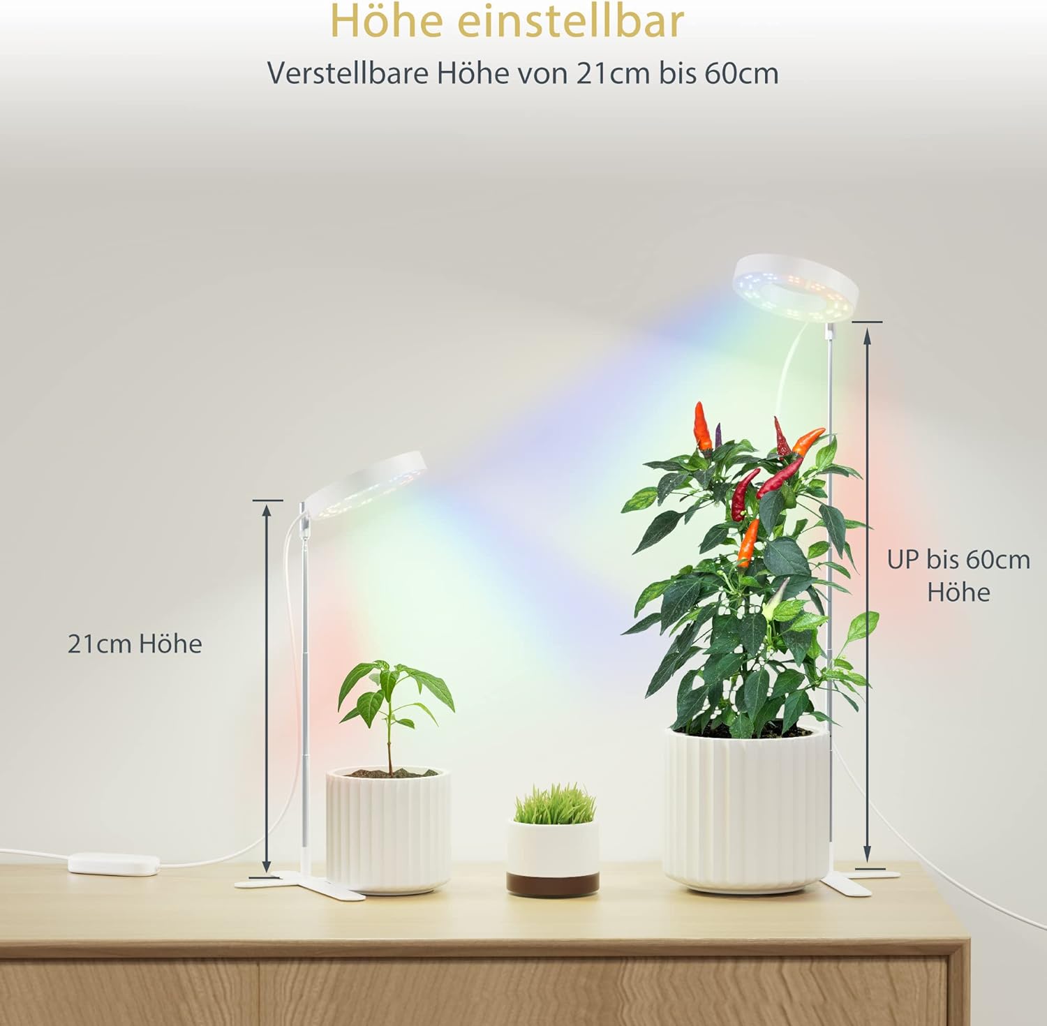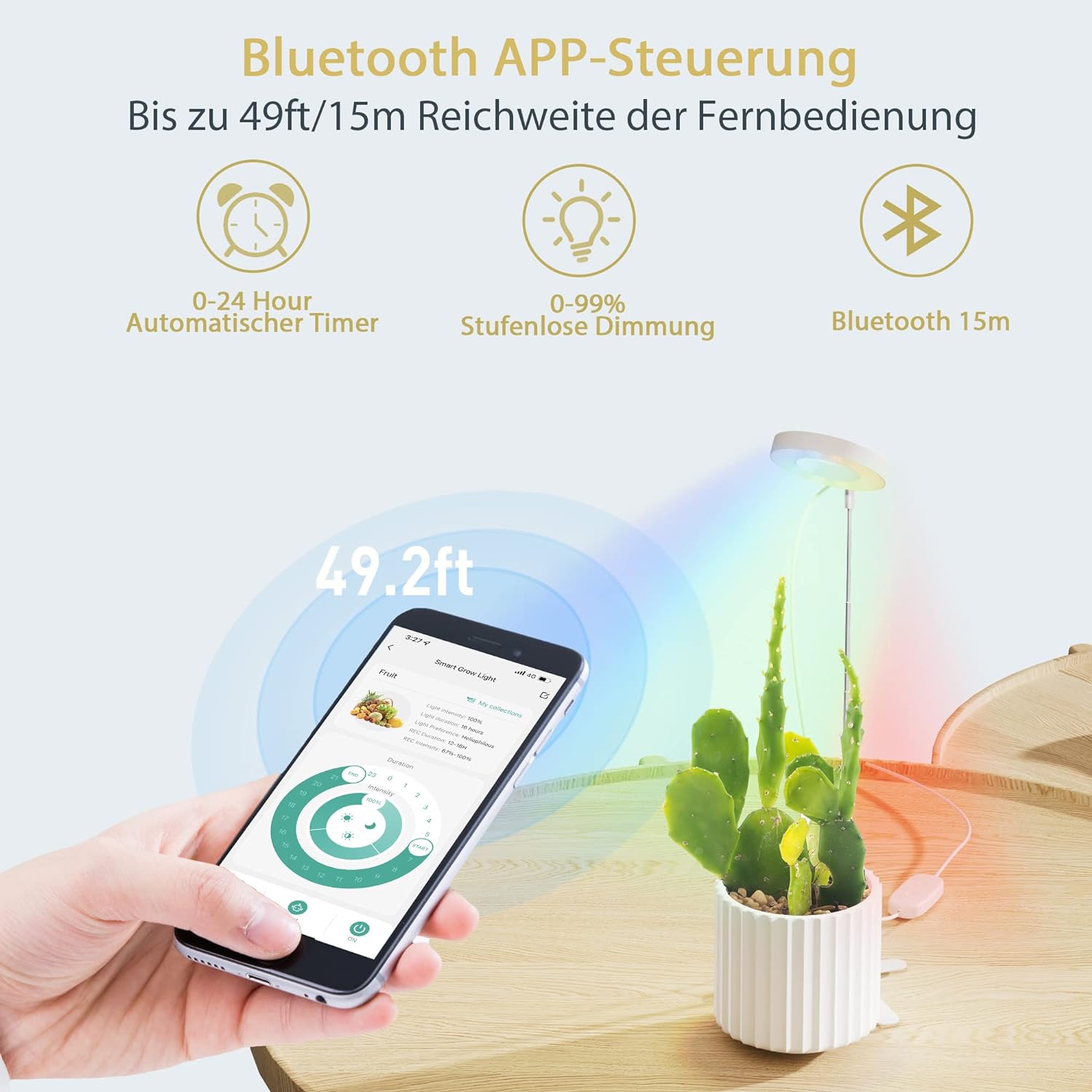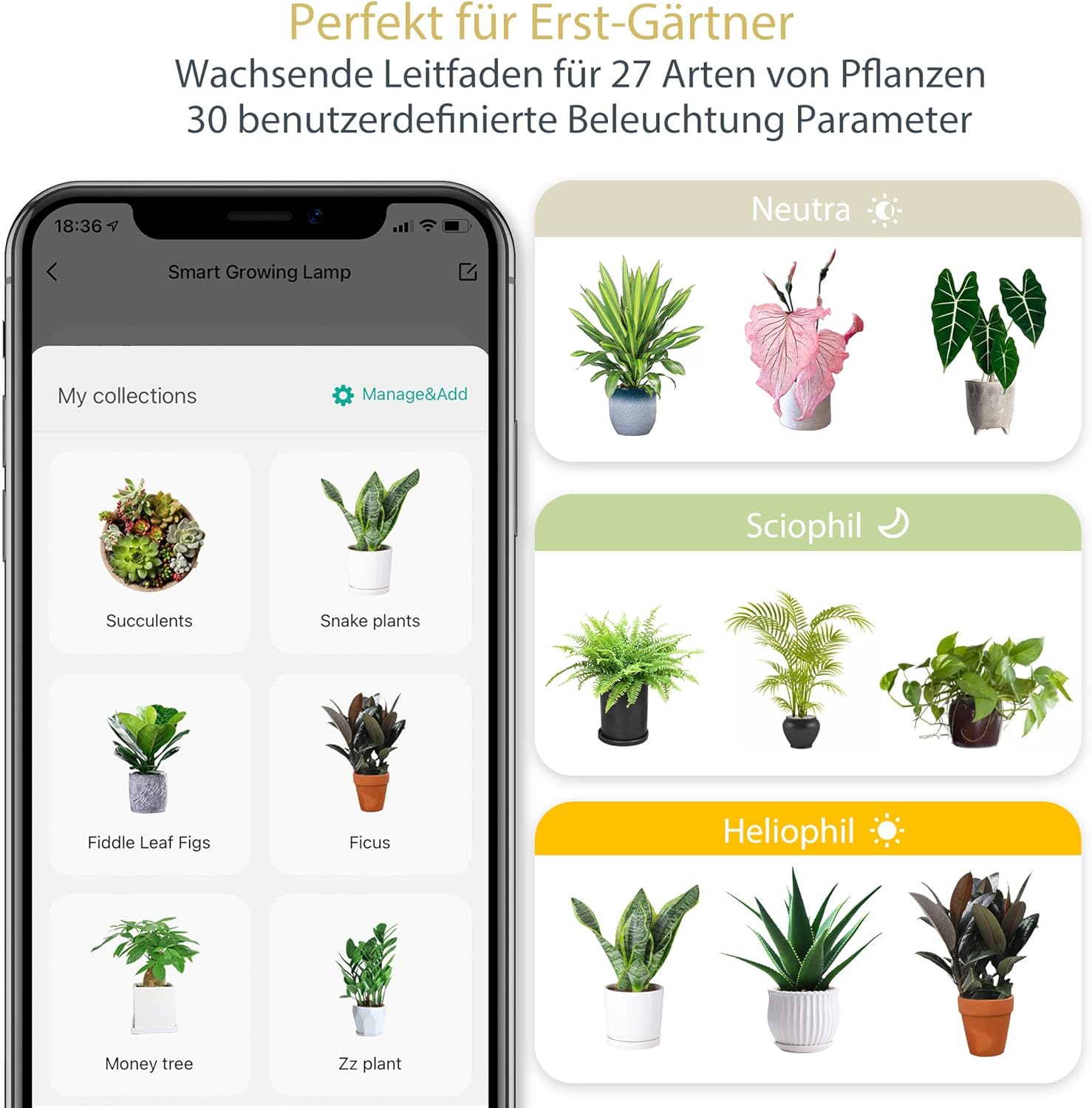 Pflanzenlicht LED Vollspektrum, APP mit Wachstumsspektrenvon 27-Pflanzen und 2 Licht-Modi, Wachstumslicht mit Zeitschaltuhr für Zimmerpflanzen Blumen, Bonsais, Gemüse