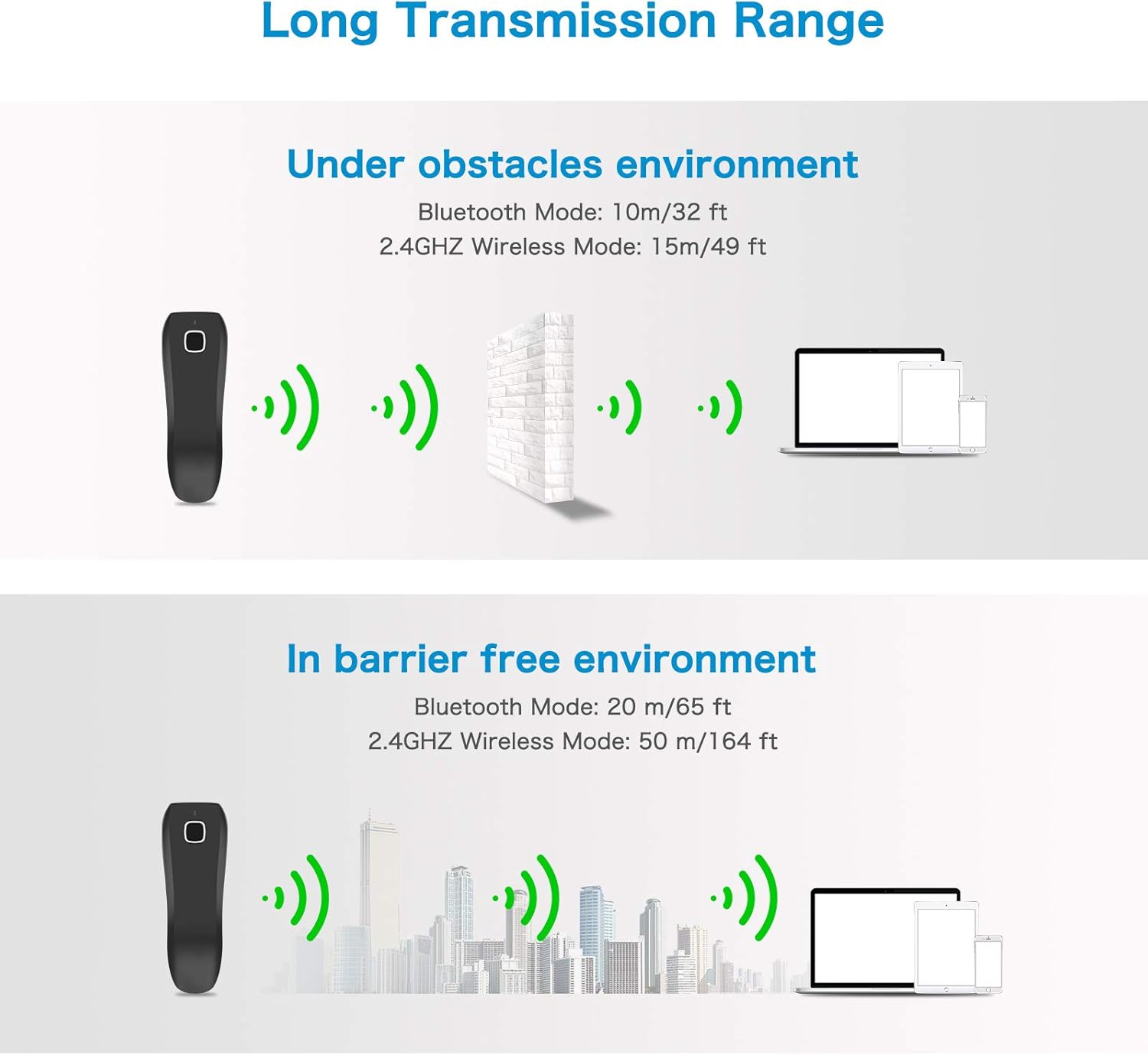 - Der Pocket-Barcode-Scanner verfügt über ein 3-in-1-Verbindungsdesign: Kompatibel mit der Bluetooth-Funktion; 2.4G Funkverbindungsempfänger; Kabelverbindung. Einfach mit Ihrem Laptop, PC, Mobiltelefon, Tablet, iPhone, iPad, POS verbunden. Arbeiten Sie mit Windows XP / 7/8/10, Mac OS, Windows Mobile, Android OS und iOS