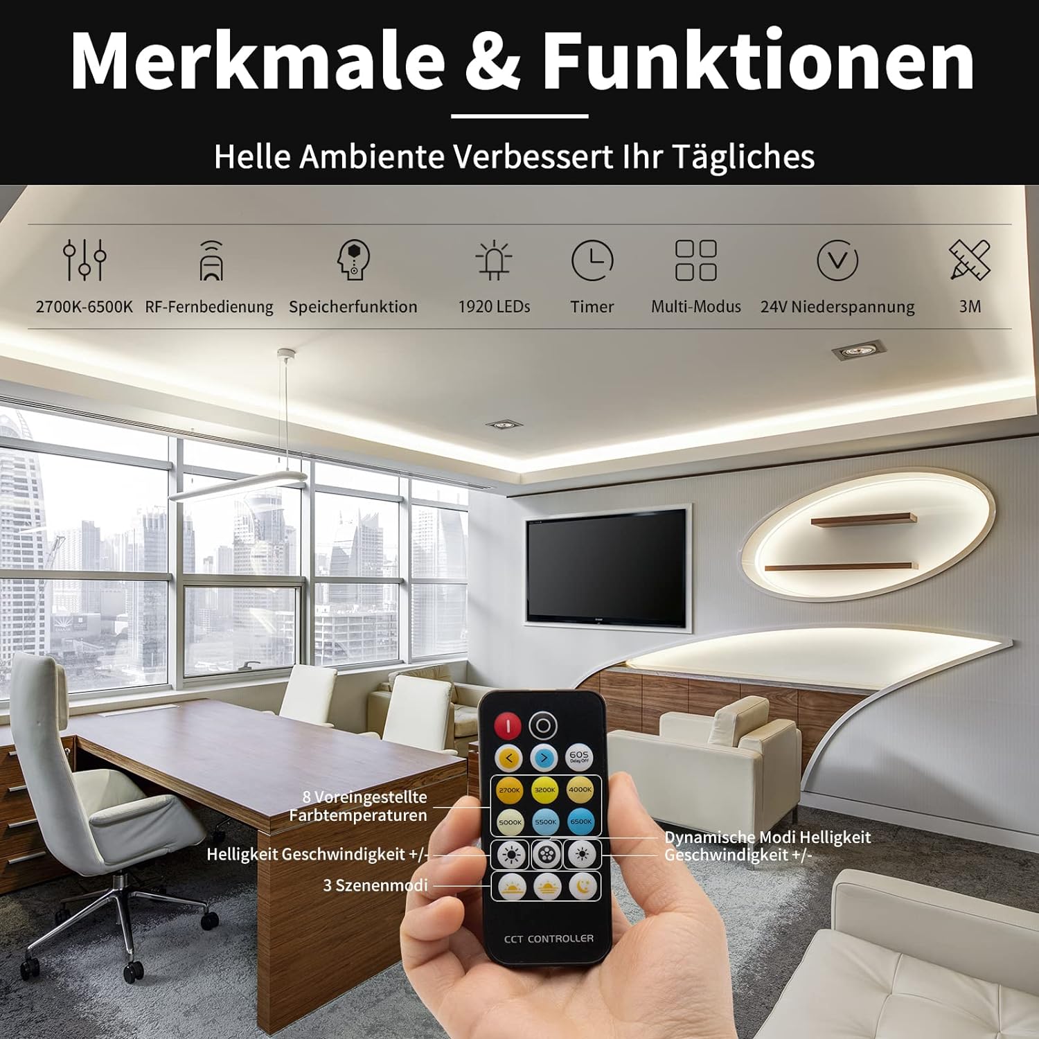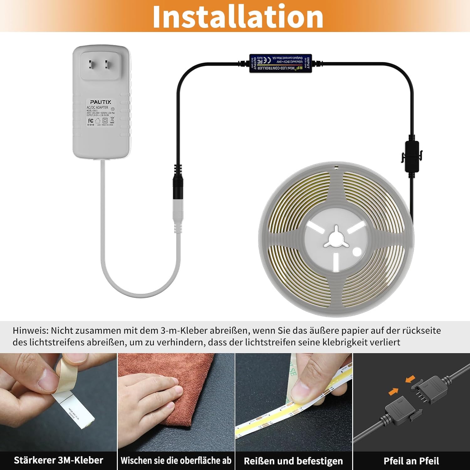 【Was Sie erhalten】 1 x PAUTIX 3M abstimmbarer weißer COB-LED-Streifen, 1 x 24V / 1A GS-gelistetes Netzteil, 1 x RF-Fernbedienung, 1 x Controller-Empfänger, 1 x Benutzerhandbuch. Wir bieten lebenslangen Kundendienst