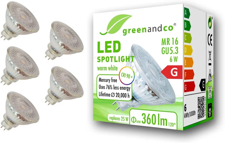 EINSATZBEREICH: Dieser greenandco LED Spot ersetzt herkömmliche 12V GU5.3/MR16 Halogenstrahler mit 40W Leistung. Der Abstrahlwinkel beträgt 36°, damit eignet sich die Lampe hervorragend zur Akzentbeleuchtung. Die Form und die Abmessungen entsprechen denen eines herkömmlichen Halogenspots mit 50mm Durchmesser.