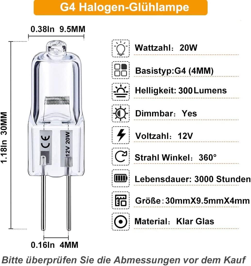4,【Einfache Installation】: Durchmesser: 0.31" (8mm), Länge: 1.18" (30mm), Sockel: G4 Bi-Pin (4mm oder 0.16" auseinander), 0.7mm Durchmesser (aktualisiert), G4 Halogenbirne 12v mit Standard G4 Bi-Pin Sockel, Einfach und schnell zu installieren ohne Probleme, gute Kompatibilität. Sie müssen nur diese halogenlampe g4 20w in die leeren Fassungen einsetzen. instand on, 360° Abstrahlwinkel.