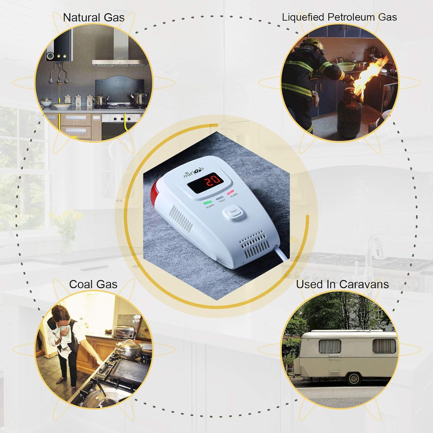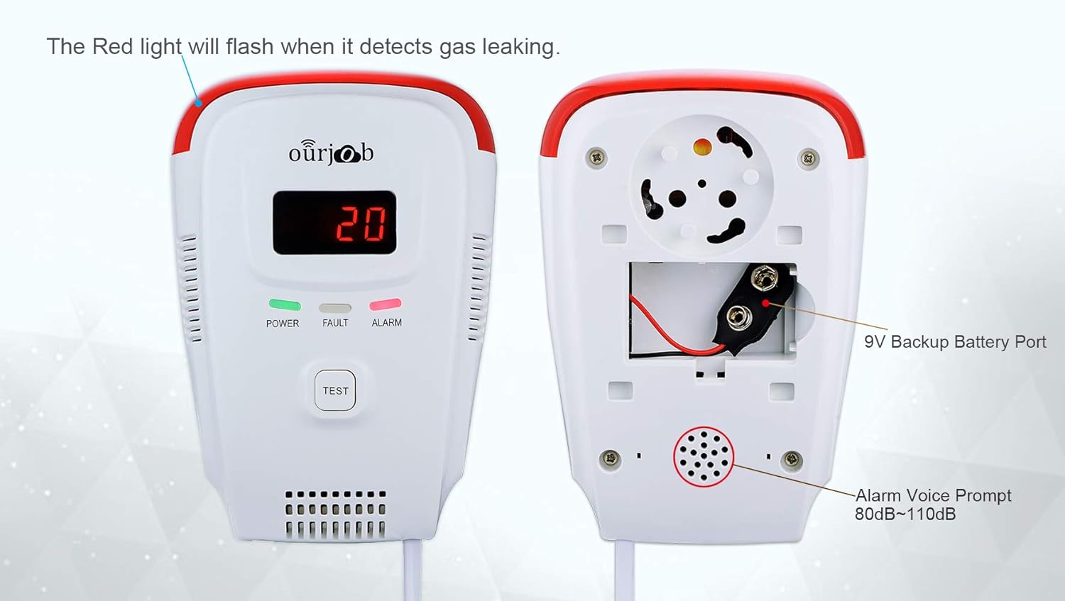 【Halten Sie Safty】-- Wenn brennbare Gase austreten (Küche Methan / Erdgas / Camping Propan) die Norm überschreiten, wird dieser Alarm eine 80dB Sirene sprechende Stimme mit oben blinkendem rotem Licht ertönen, bis die Umgebungsgasmenge unter den Alarmsollwert fällt.