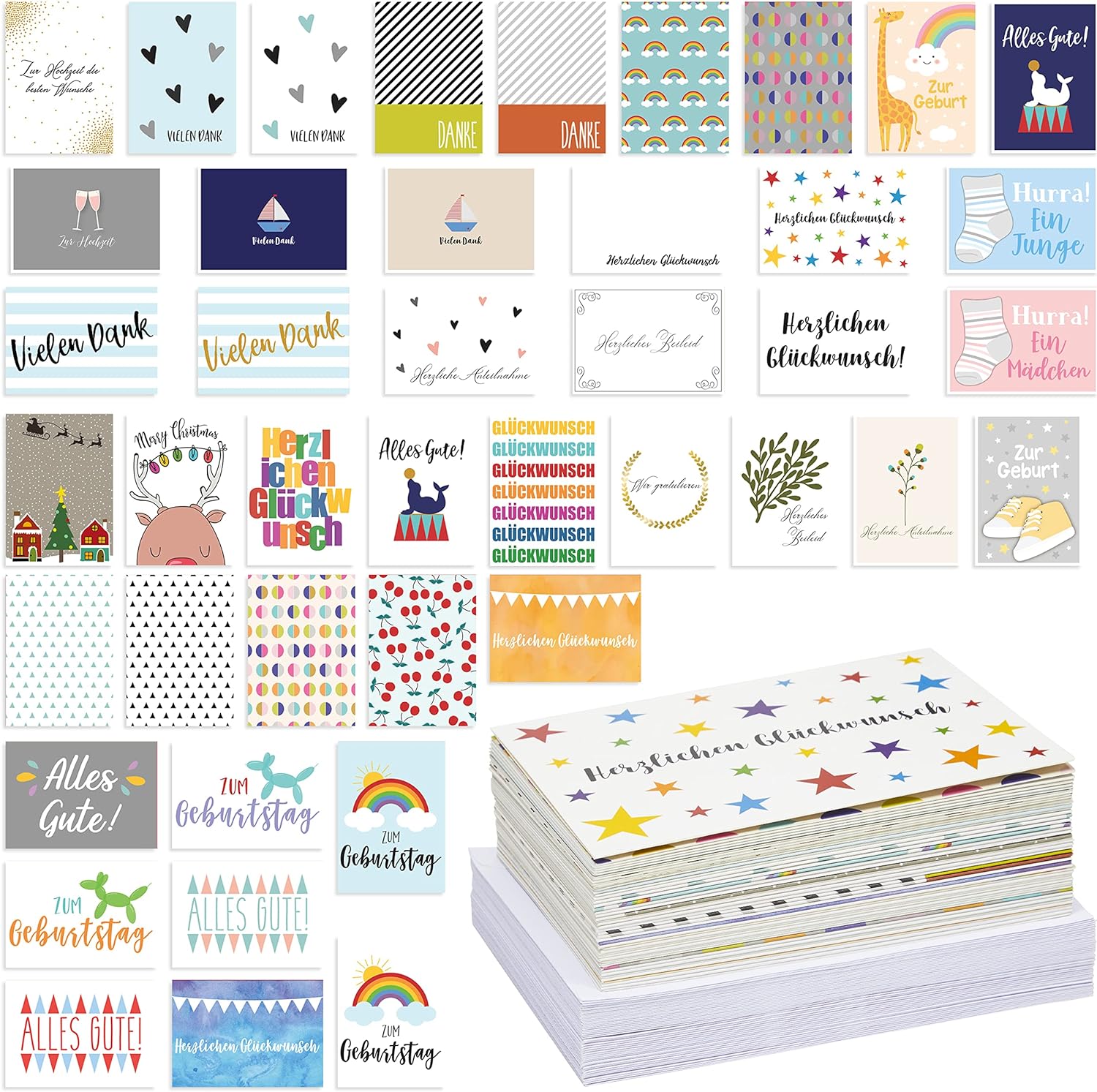Super Preis-Leistungs-Verhältnis: Das Set umfasst 48 unterschiedliche designte Karten sowie Briefumschläge