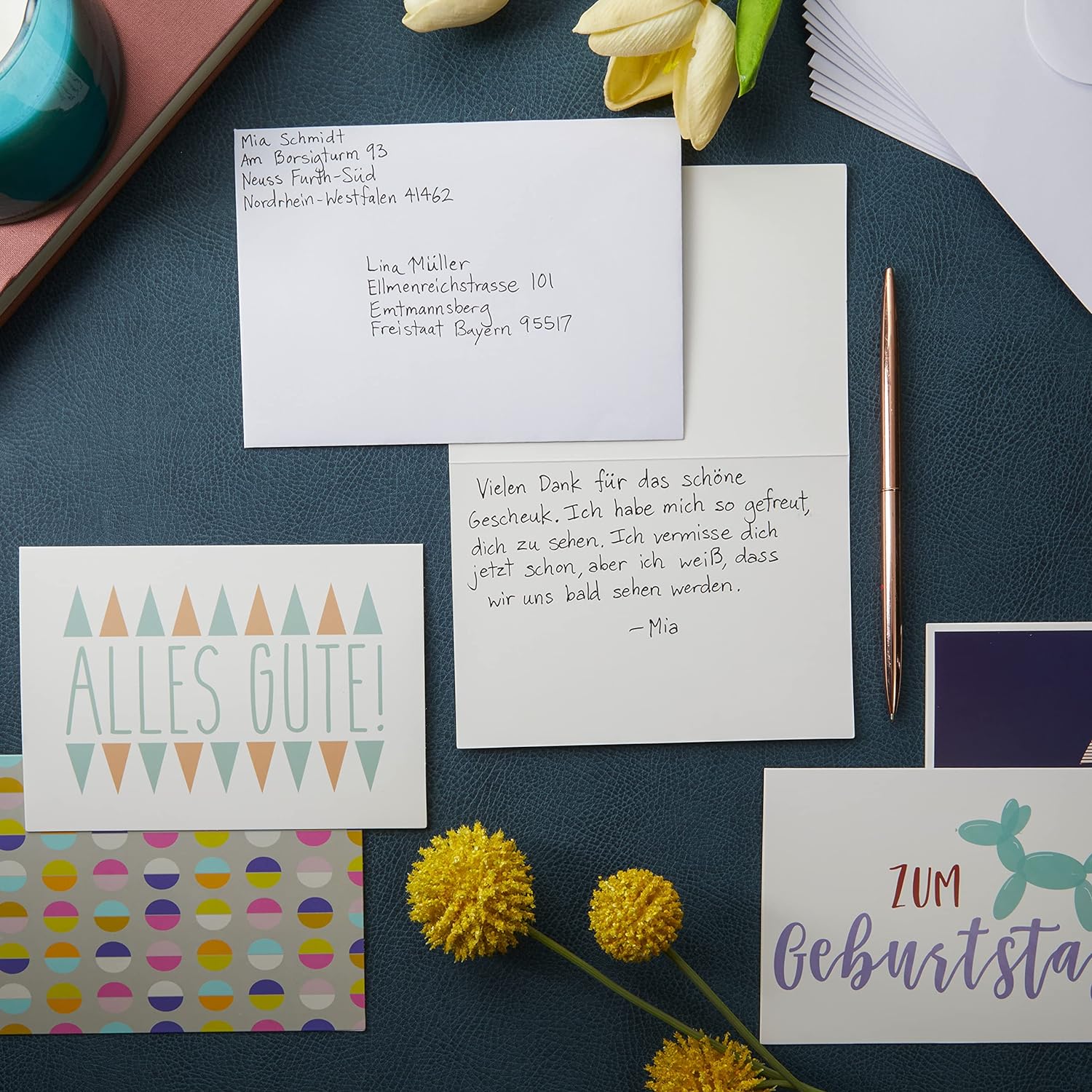 Motive: Die Karten mit verschiedenen Themen, sind mit Sätzen wie "Glückwunsch" oder "Alles Gute" auf deutsch versehen
