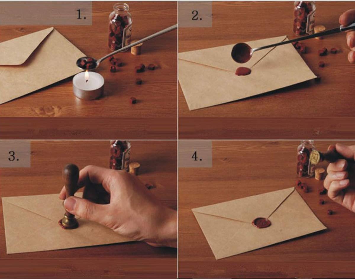 Einfache Anwendung: Verwenden Sie die weiße Kerze, um den Löffel mit Wachs zu erwärmen, während das Wachs vollständig schmilzt, lassen Sie es auf den Umschlag oder an eine andere Stelle, an der Sie etwas versiegeln möchten, tropfen. Dann verwenden Sie den Stempel zum Drucken. Der Löffel sollte sauber abgewischt werden, wenn mit einer anderen Farbe versiegelt wird.