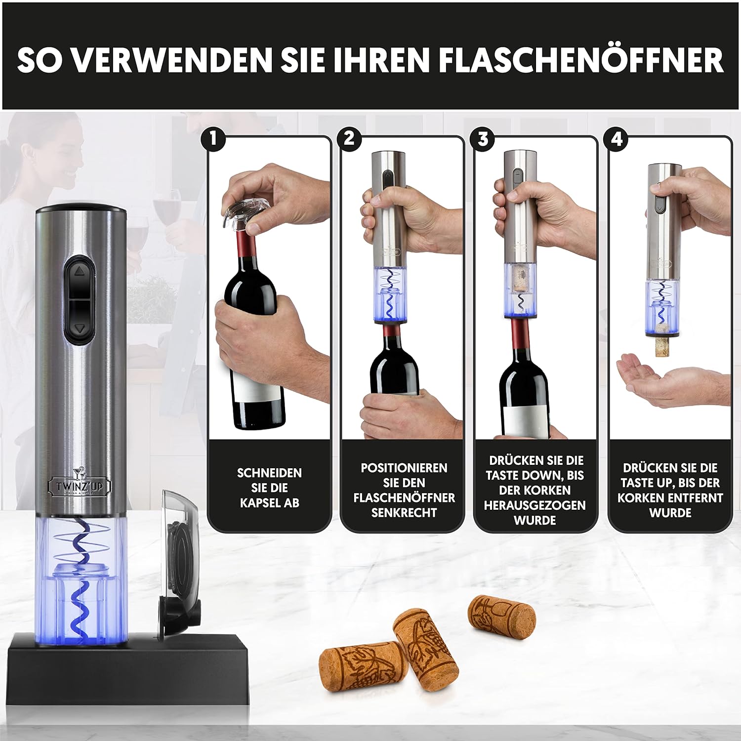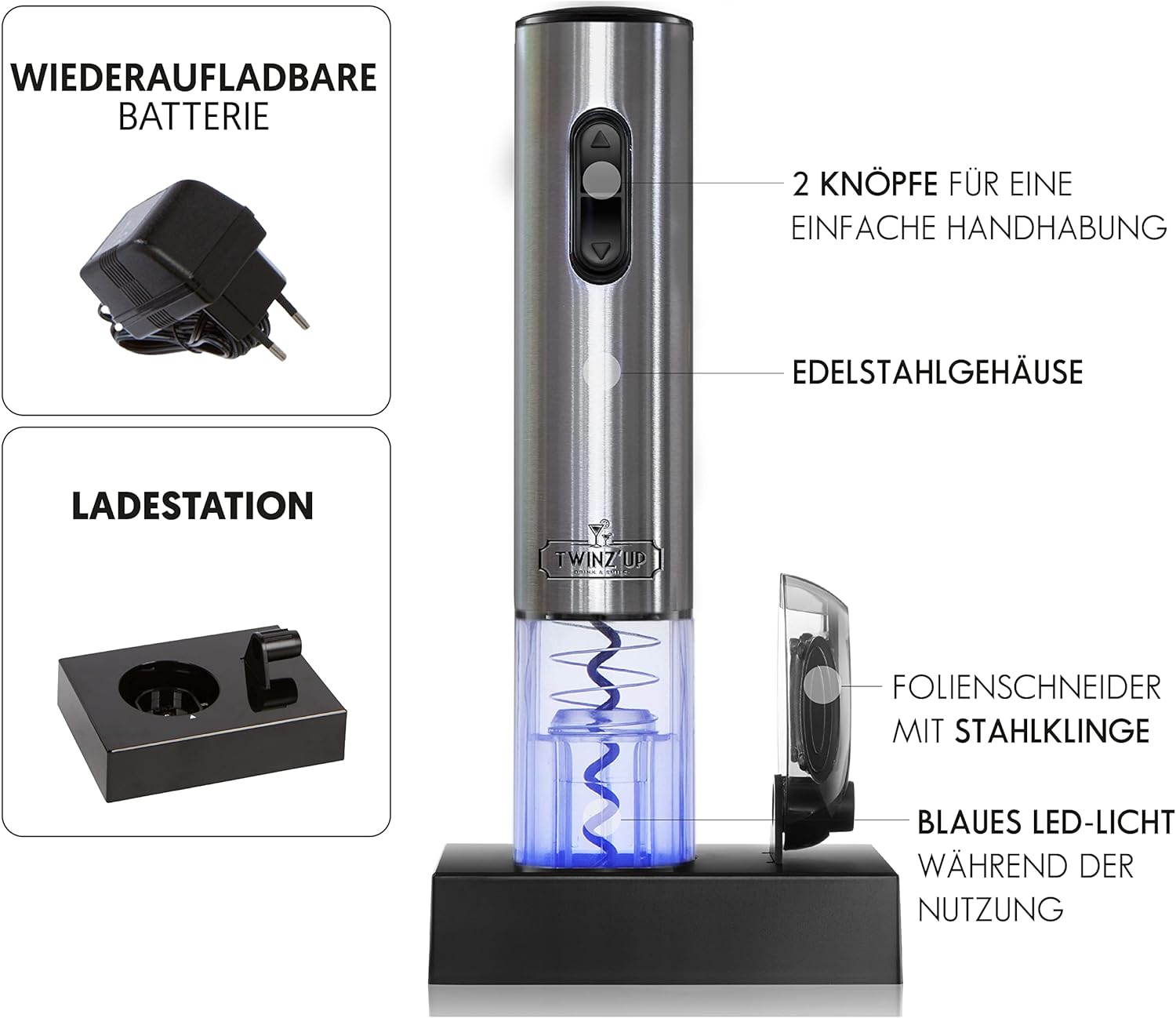 BEEINDRUCKEN SIE IHRE GÄSTE – Mit dem schnurlosen Flaschenöffner von Twinz’up öffnen Sie eine Flasche Wein in nur 8 Sekunden, indem Sie einfach auf einen Knopf drücken. Er leuchtet blau auf, wenn er eingeschaltet ist und der Korken herausgezogen wird. Der Korkenzieher funktioniert mit den meisten Flaschen- und Korkenarten (Kork oder Kunststoff). Das Öffnen Ihrer Flaschen war noch nie so einfach.