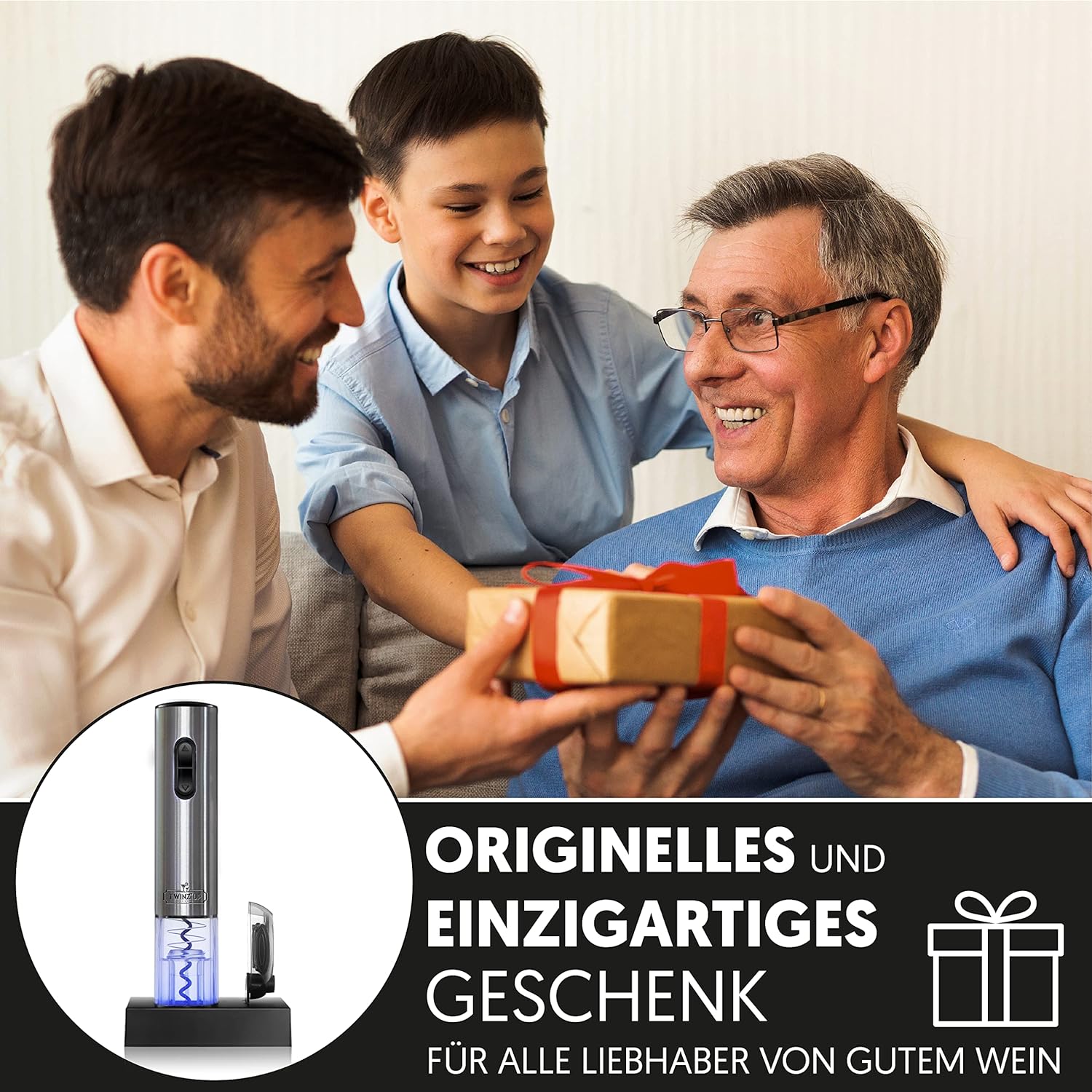 PERFEKT ALS GESCHENK - Der elektrische Korkenzieher wird mit einem Folienschneider und einer Ladestation geliefert. Dieses komplette Set wird jedem Weinliebhaber gefallen, sei er Mann oder Frau. Diese Box eignet sich auch perfekt als Geschenk für besondere Anlässe: Vatertag, Vatertagsgeschenk, Geburtstage, Hochzeiten, Einweihungspartys, Junggesellen- oder Junggesellinnenabschiede…