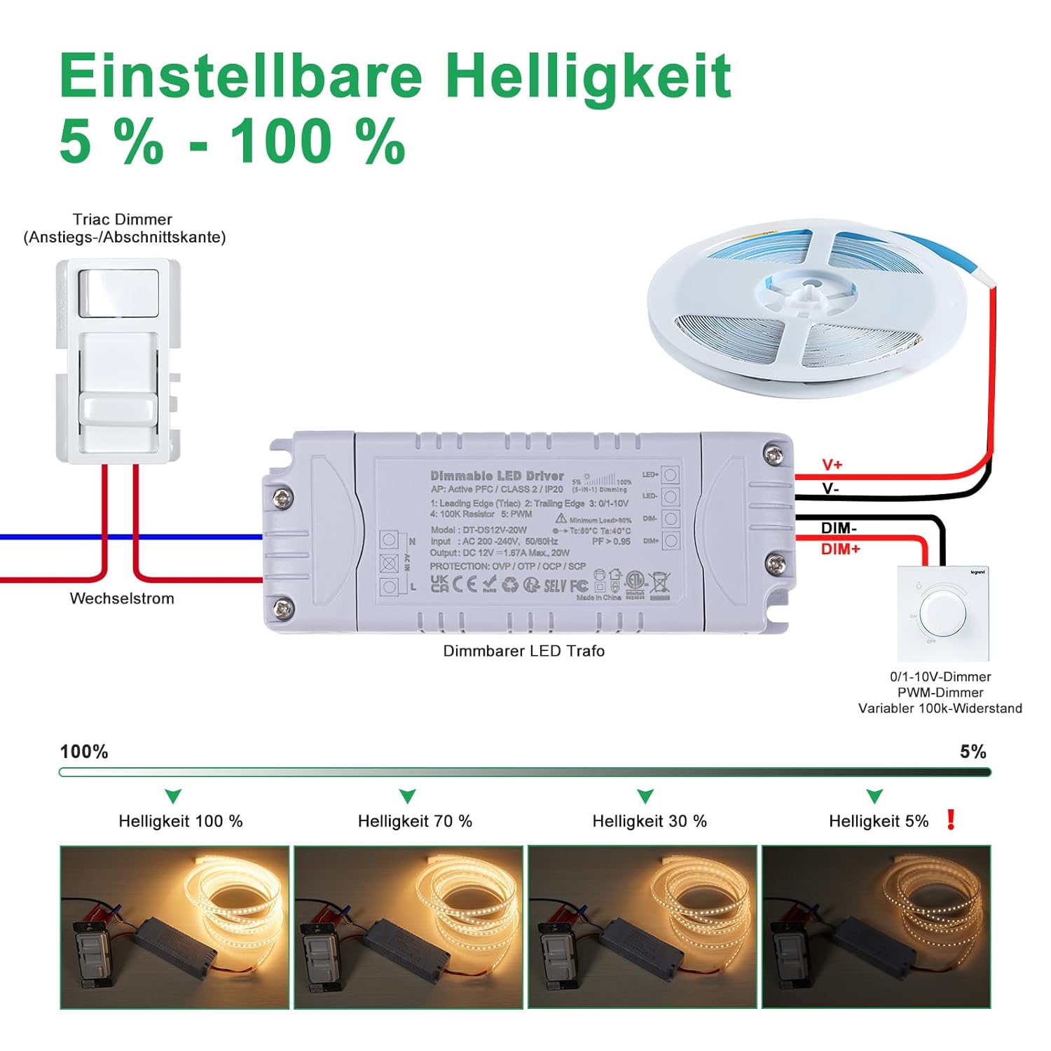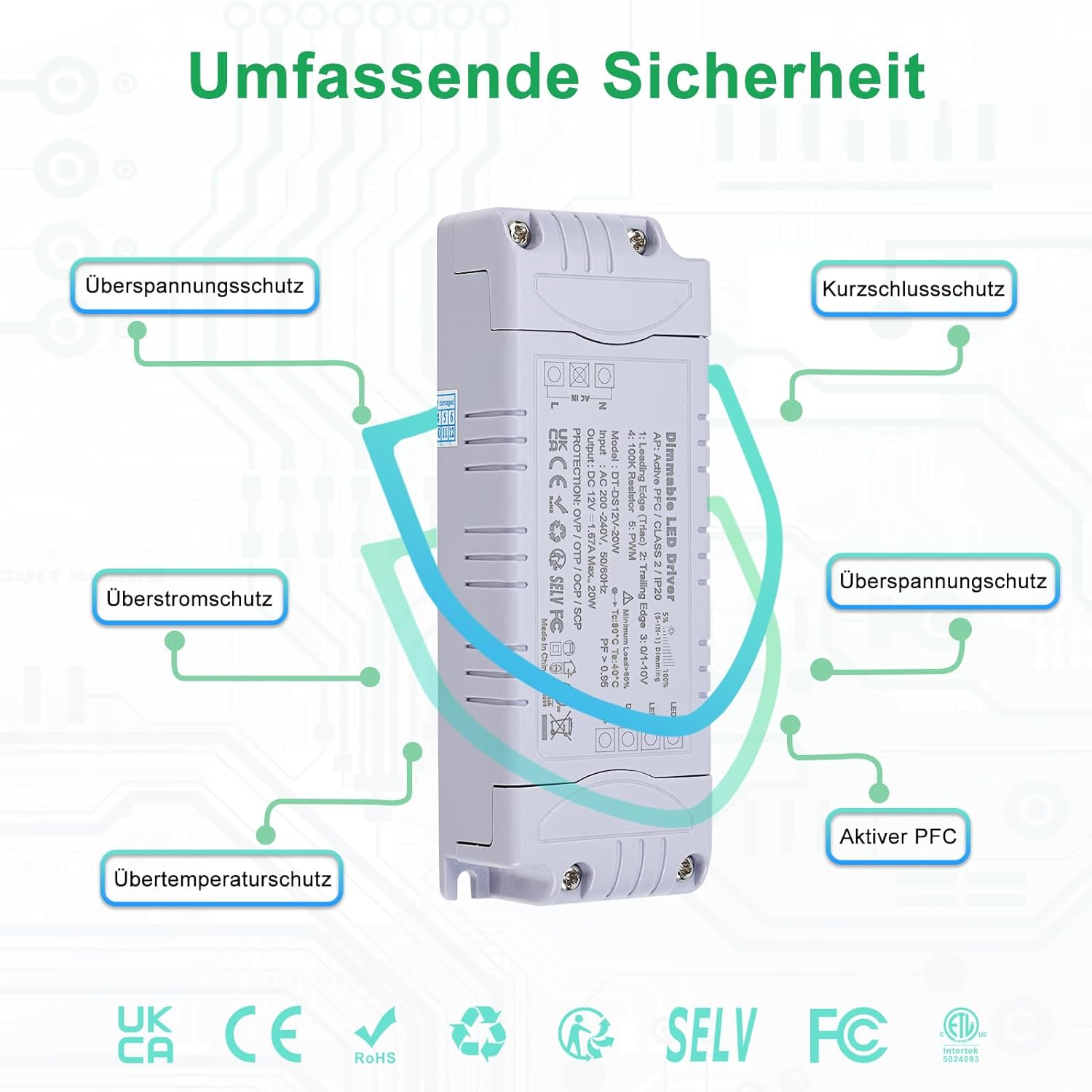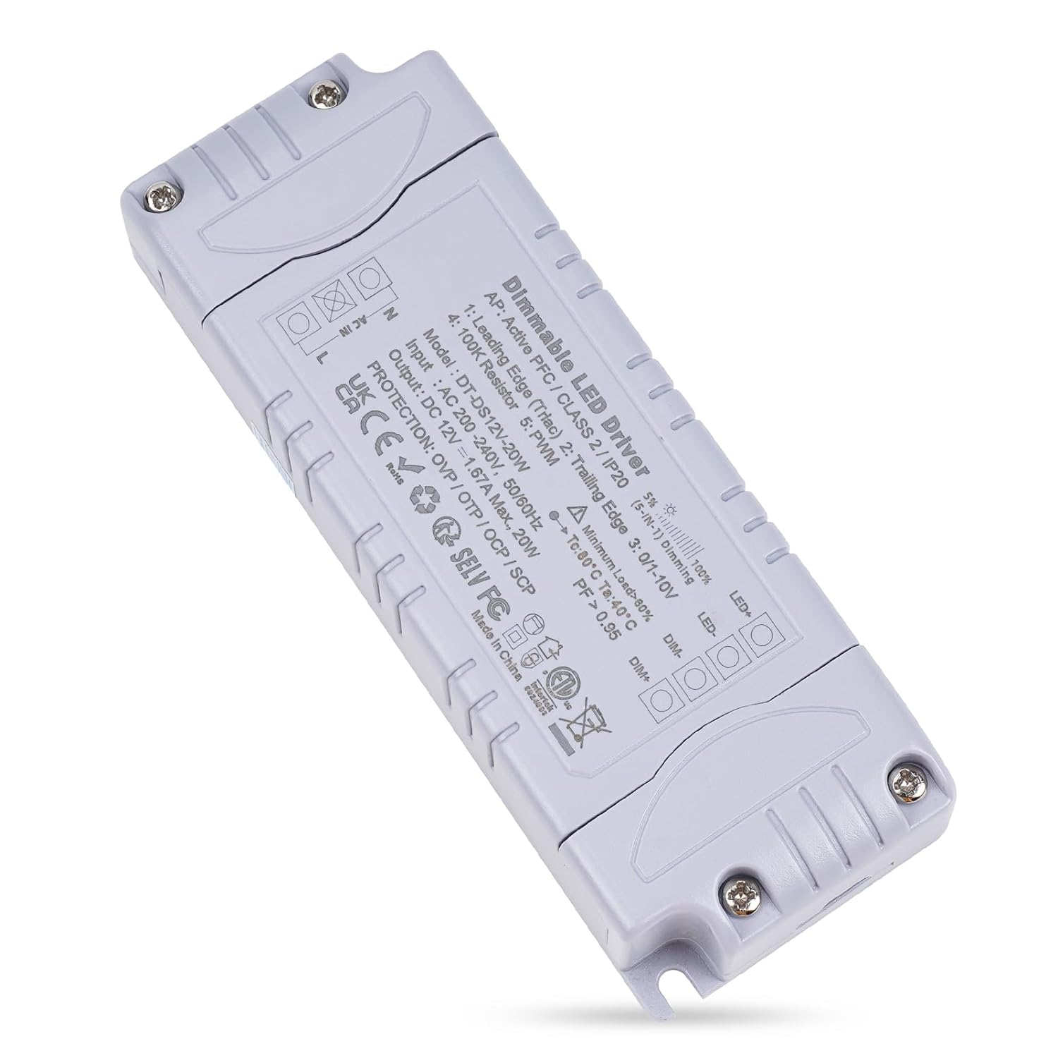 Dimmbarer led trafo mit konstanter Spannung. Unterstützt verschiedene Dimmmethoden, einschließlich Triac, 0-10 V, 1-10 V, 100 K Widerstand und PWM, AC 200-240V Eingang, 12V Gleichstrom Ausgang, 20 Watt Maximale Leistung, 50/60 Hz. Flammhemmendes Material, mit Schutzklasse II.