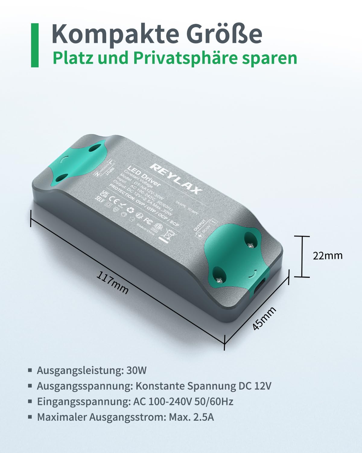 【Sicher und Langlebig】Konstanter Spannungs LED Trafo 100-240V (AC) auf 12V (DC) 2.5A, max. 30W. Hergestellt aus flammhemmenden Materialien und robustem isolierendem Kunststoffgehäuse garantiert dieses staubdichte und feuerfeste led netzteil 12v sicheren Betrieb in trockenen und feuchten Umgebungen.