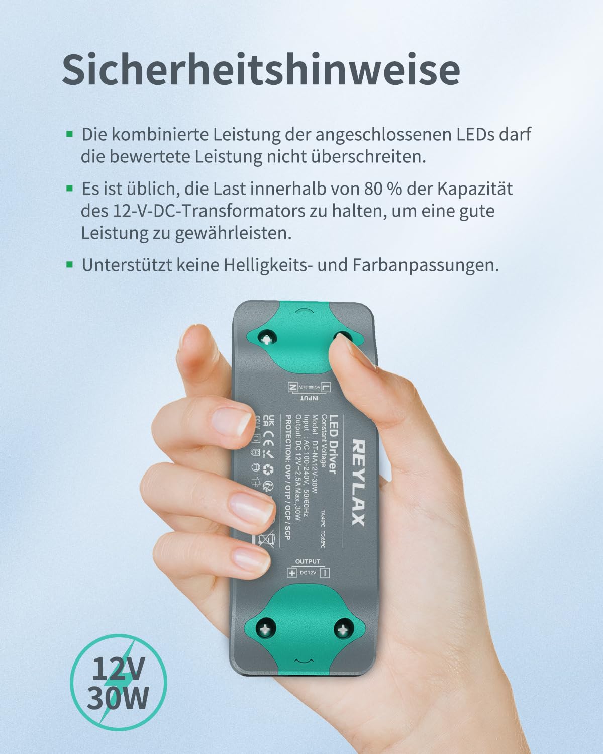 【WICHTIGE HINWEISE】Um Effizienz und Leistung zu maximieren, stellen Sie sicher, dass die Belastung 80 % der maximalen Kapazität des LED trafo 12v 30w nicht überschreitet.