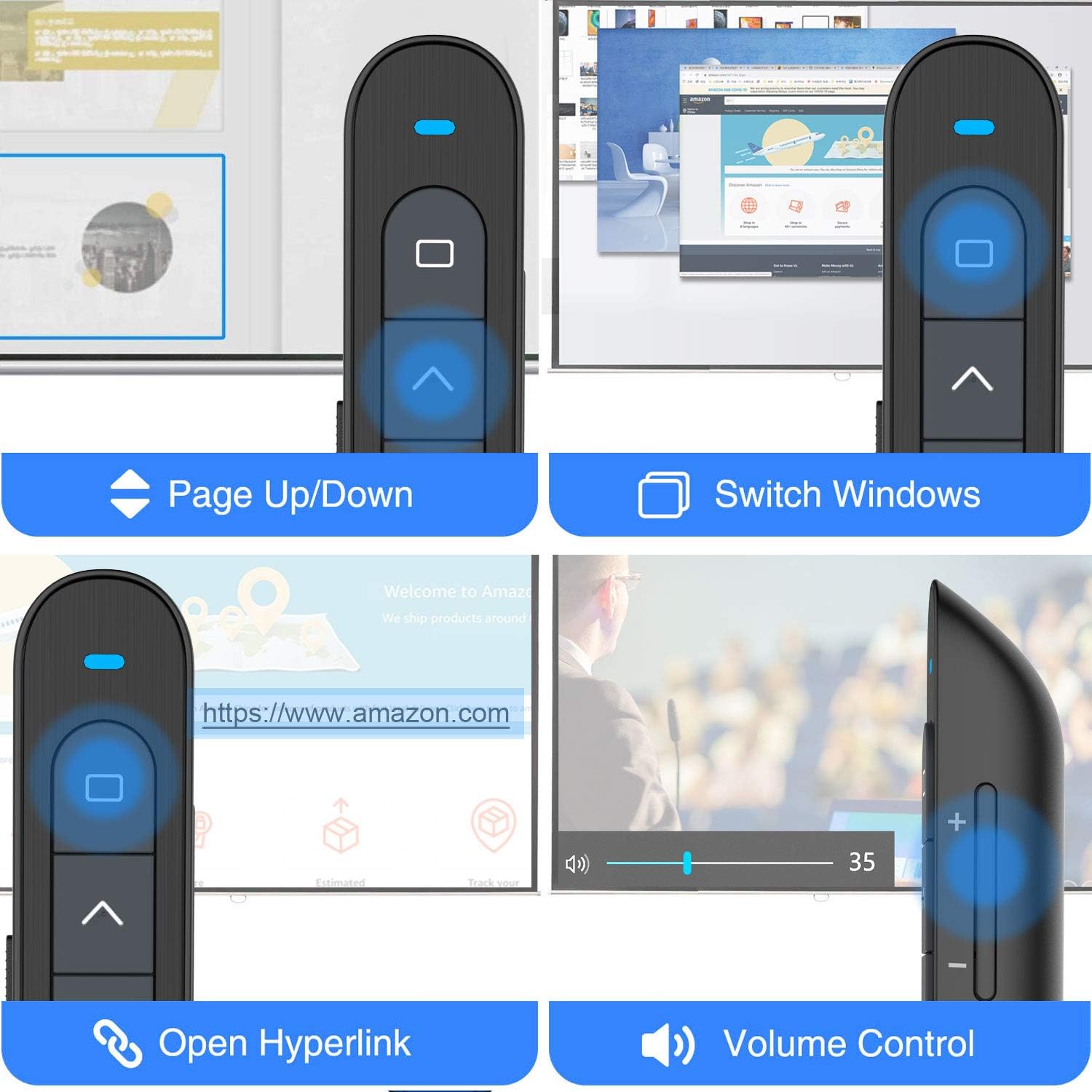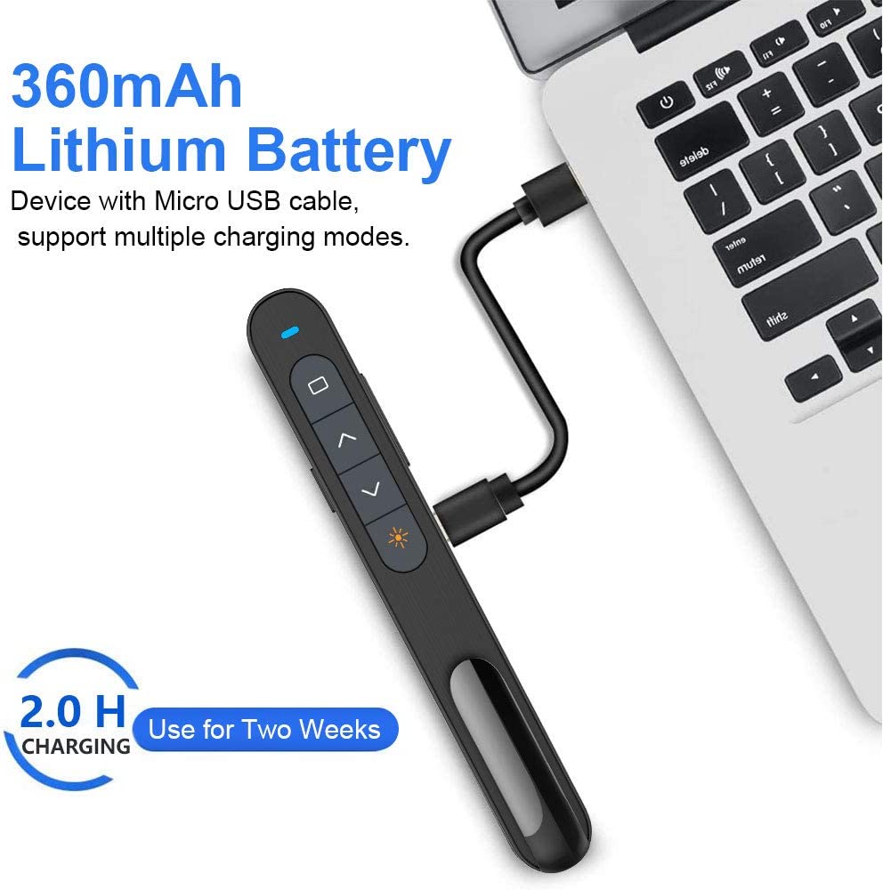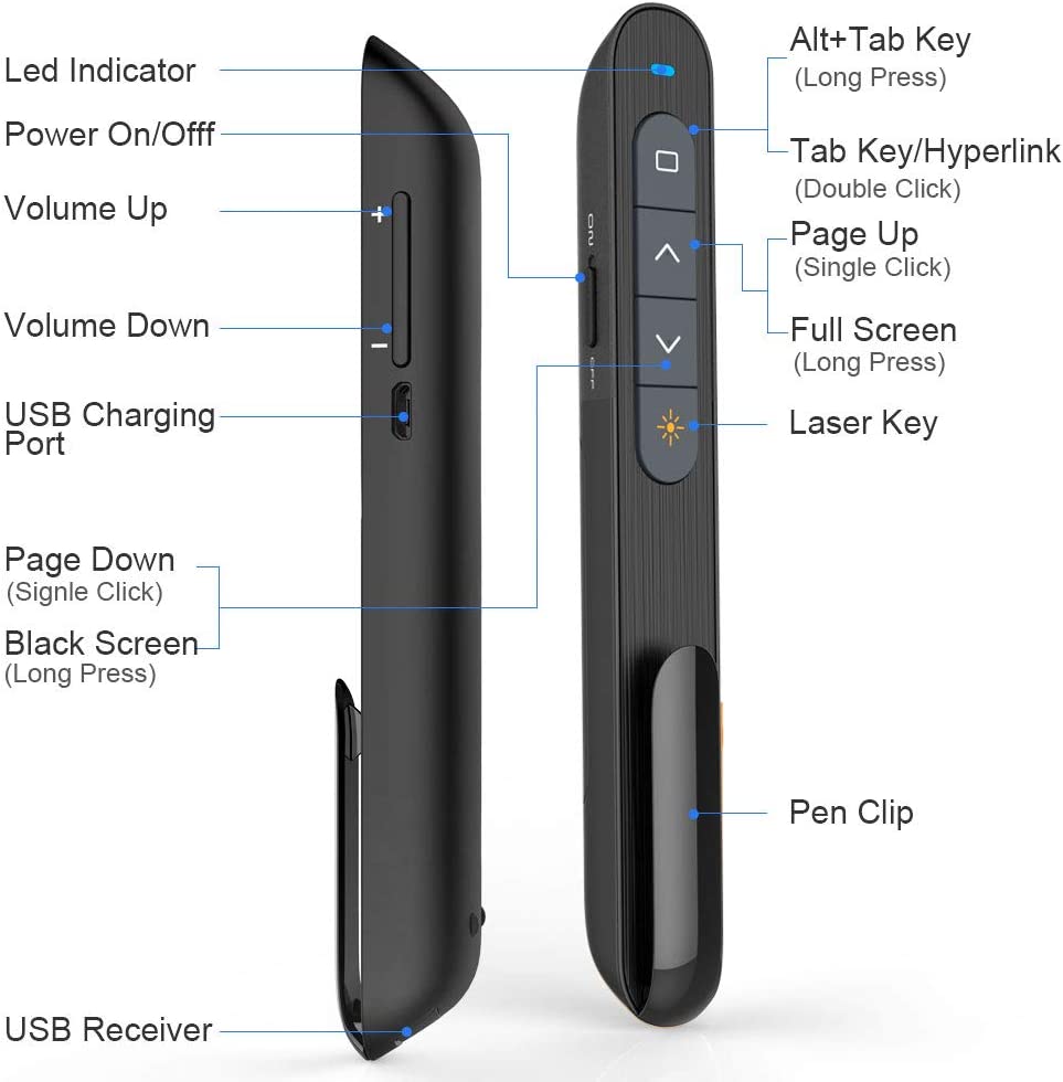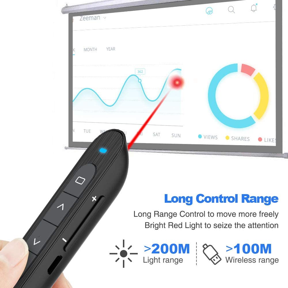 【300 ft lange Kontrollreichweite und helles rotes Licht】①Arbeitet mit einer 2,4-G-HF-Frequenz mit einer Reichweite von bis zu 300 Fuß, die beste Wahl für große Anlässe. ②Präsentations-Presenter erzeugt ein helles rotes Licht, das auf den meisten Hintergründen gut zu erkennen ist (nicht empfohlen für LED- / LCD- / TV-Bildschirme).