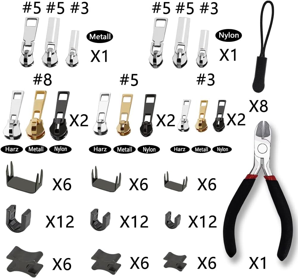 【Das Paket enthält】Universal-Reißverschluss-Reparaturset ist eine großartige Lösung für Ihre Reißverschluss-Ersatzbedürfnisse. Es beinhaltet 6 goldene Metall-Reißverschlüsse, 6 silberne Kunststoff-Reißverschlüsse, 6 schwarze Nylon-Reißverschlüsse, 3 silberne Metall-Reißverschlüsse, 3 silberne Nylon-Reißverschlüsse, in drei Größen (3#, 5#, 8#). Darüber hinaus sind 8 Reißverschluss-Verlängerungszüge, 36 Reißverschluss-Stop oben, 36 Reißverschluss-Stop unten und 1 Reißverschluss-Zange enthalten.
