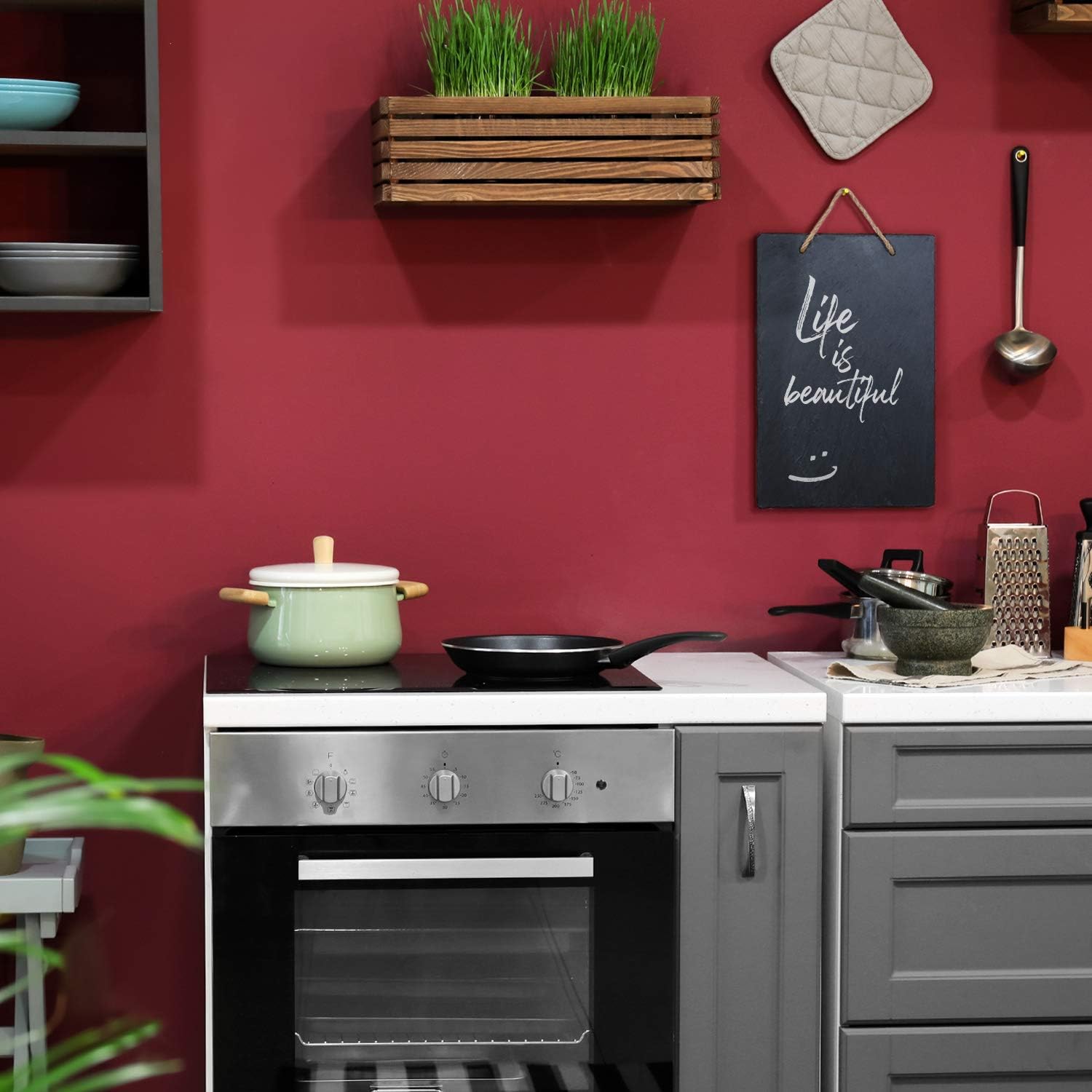 Die Wandtafel ist zum individuellen Beschriften mit Kreide geeignet und verfügt über zwei vorgebohrte Löcher zum Aufhängen, z. B. in der Küche als Menütafel
