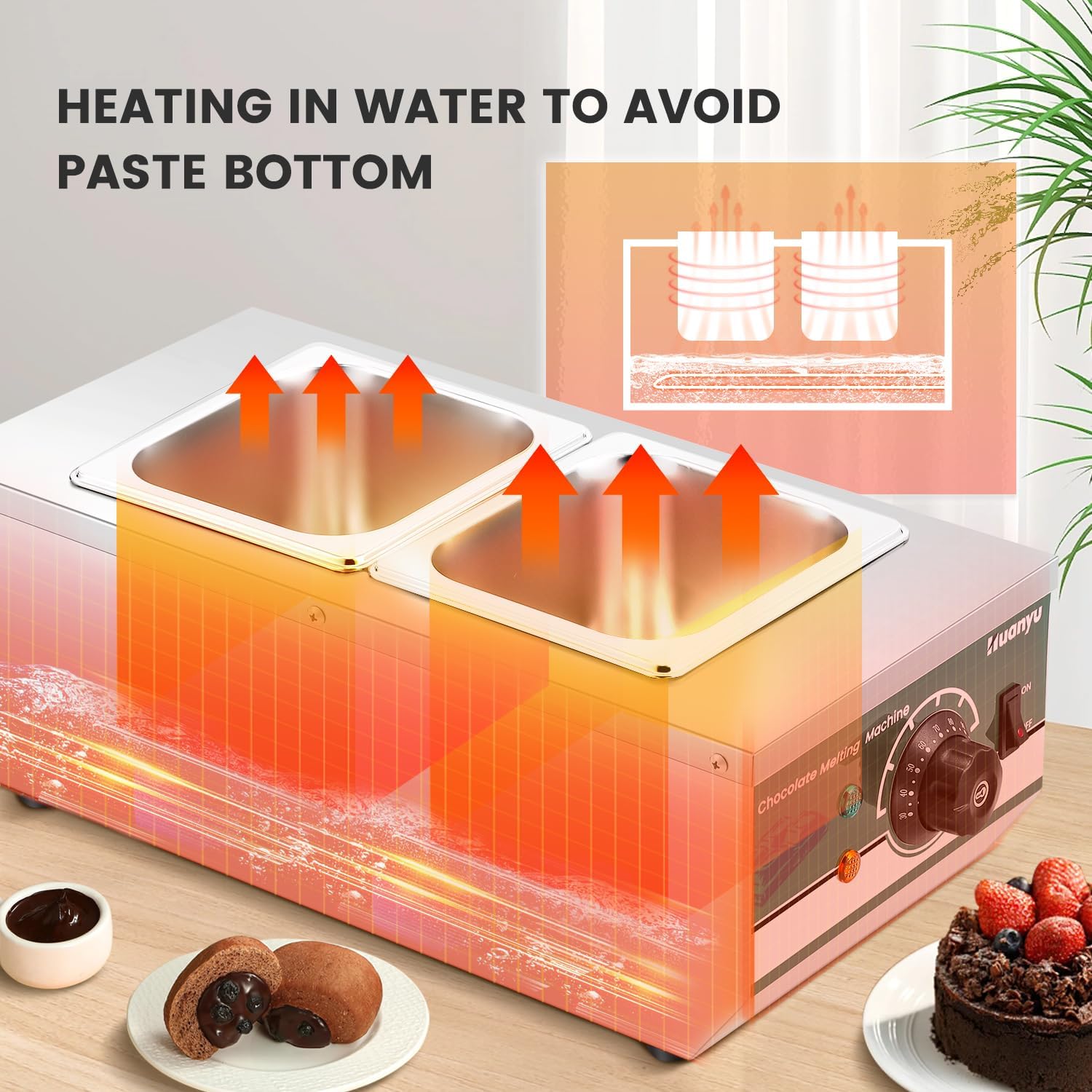 【Wassererwärmung】Der Schokoladenschmelzer verwendet die Wassererwärmungsmethode, gleichmäßig schmelzende Schokolade in separatem Wasser macht glattere Soßenwirkung und vermeidet klebrigen Boden.