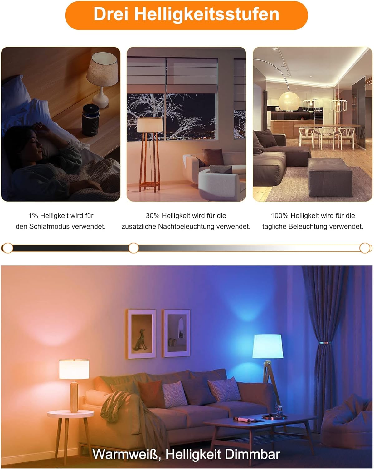 【Speicherfunktion】Schalten Sie die Lampe aus und wieder ein, die LED-Lampe merkt sich die zuletzt verwendete Farbe, Helligkeit oder den Modus.