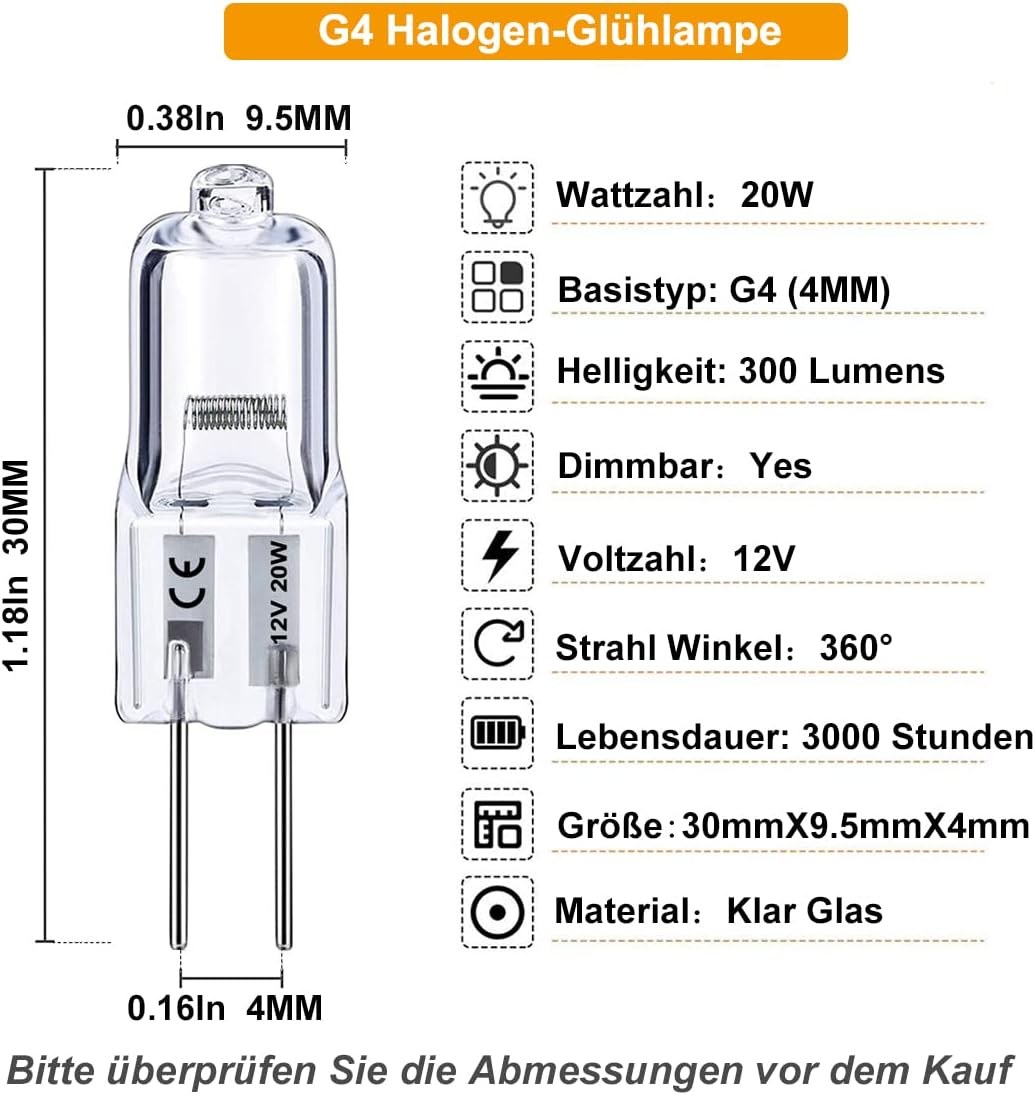 4,【Easy installation】: Durchmesser: 0.31" (8mm), Länge: 1.18" (30mm), Sockel: G4 Bi-Pin (4mm oder 0.16" auseinander), 0.7mm Durchmesser (aktualisiert), G4 Halogenbirne 12v mit Standard G4 Bi-Pin Sockel, Einfach und schnell zu installieren ohne Probleme, gute Kompatibilität. Sie müssen nur diese halogenlampe g4 20w in die leeren Fassungen einsetzen. instand on, 360° Abstrahlwinkel.