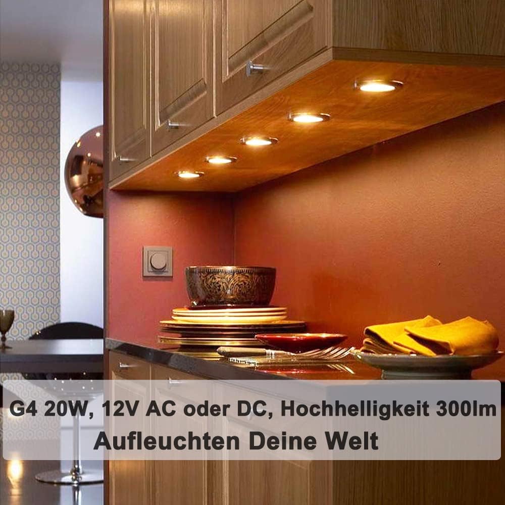 1,【Exzellente Leistung】: Hohe Leistung 300 Lumen, 2800K helles warmes Weiß, CRI100. Unsere g4 12v 20w halogen leuchtmittel bringen Ihnen warme Lichtverhältnisse wie Sonnenlicht. Der CRI bis zu 100 kann die echte Farbe des Objekts wiederherstellen, g4 Halogen macht den Ort, wo das Licht berührt, sieht bunter aus.
