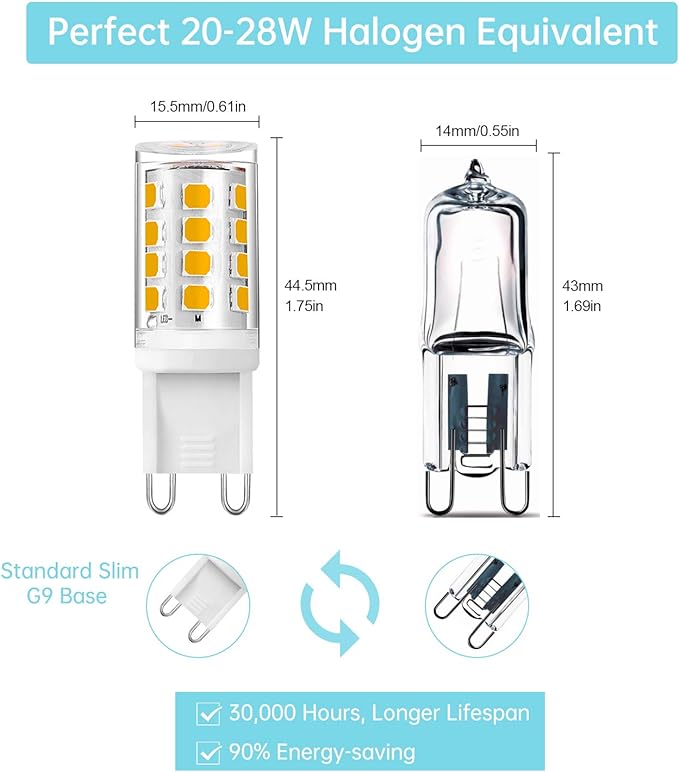 ▣ EINFACHE BEDIENUNG - Standard-G9 Sockel Mini Glühbirnen, wie herkömmliches G9-Halogen, Plug-and-Play. Lampengröße: 0,61 "* 1.75" etwas größer als herkömmliches Halogen (0,5 "* 1,69"). Bitte vor dem Kauf messen, um ausreichend Platz für die Installation zu gewährleisten