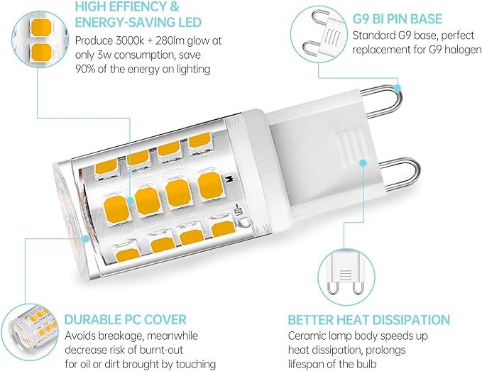 ▣ 90% ENERGIESPAREND - 3W G9 LED lampe emittiert bei 280 lm, was 20 W / 28W G9 halogenlampen entspricht; verbesserte IC + LED-Chips, verhindern visuelles Flimmern; Sofort einschalten, innerhalb von 0,5 s einschalten, keine Aufwärmzeit