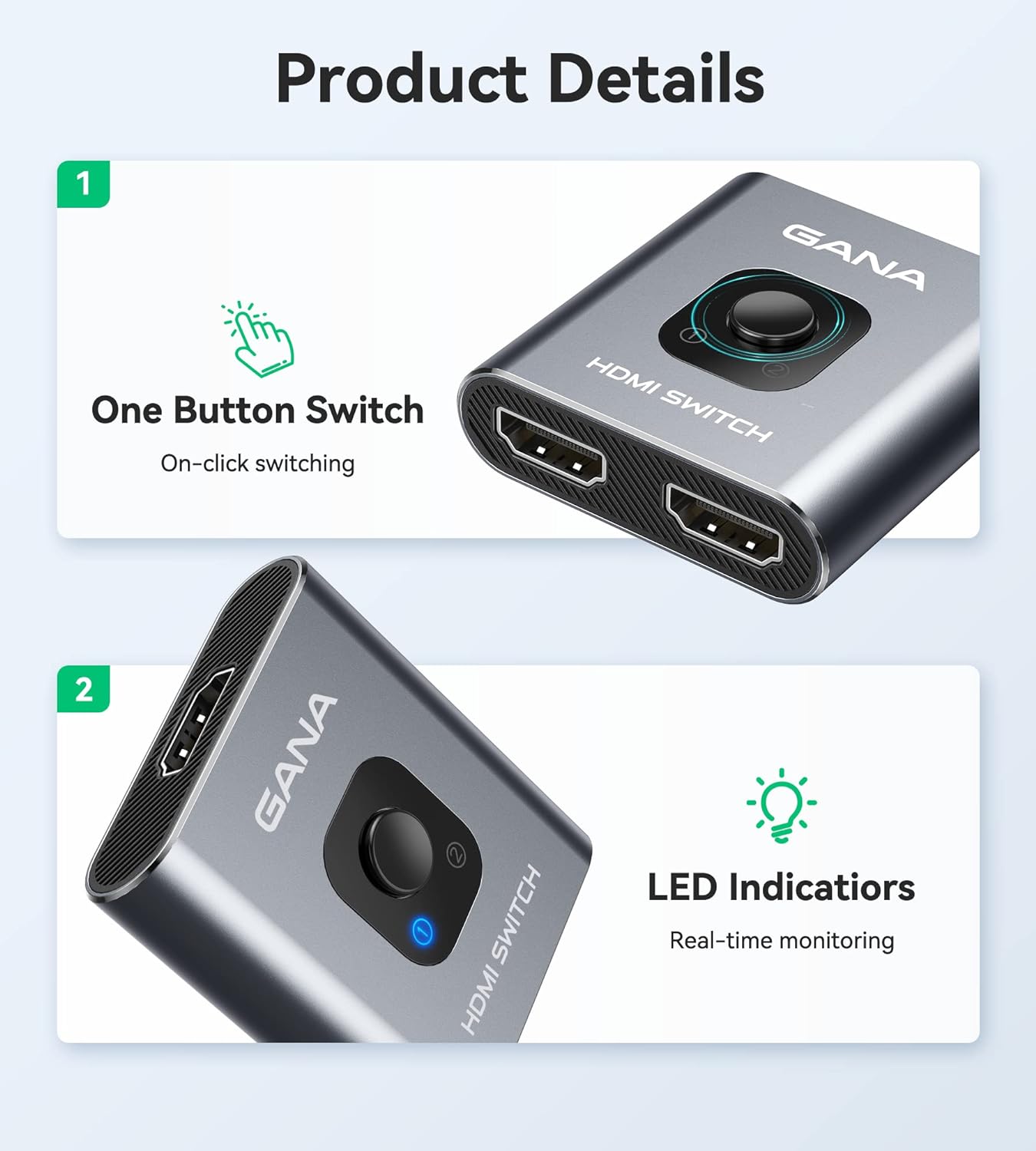 【Plug and Play】Es ist keine Installation von Treibern oder Software erforderlich. Schließen Sie einfach Ihre HDMI-Geräte an und genießen Sie nahtloses Umschalten zwischen ihnen. Die LED-Anzeige am HDMI-Umschalter erleichtert die Identifizierung der aktuell aktiven Geräte. Es wird keine externe Stromquelle benötigt. (HDMI-Kabel nicht enthalten)
