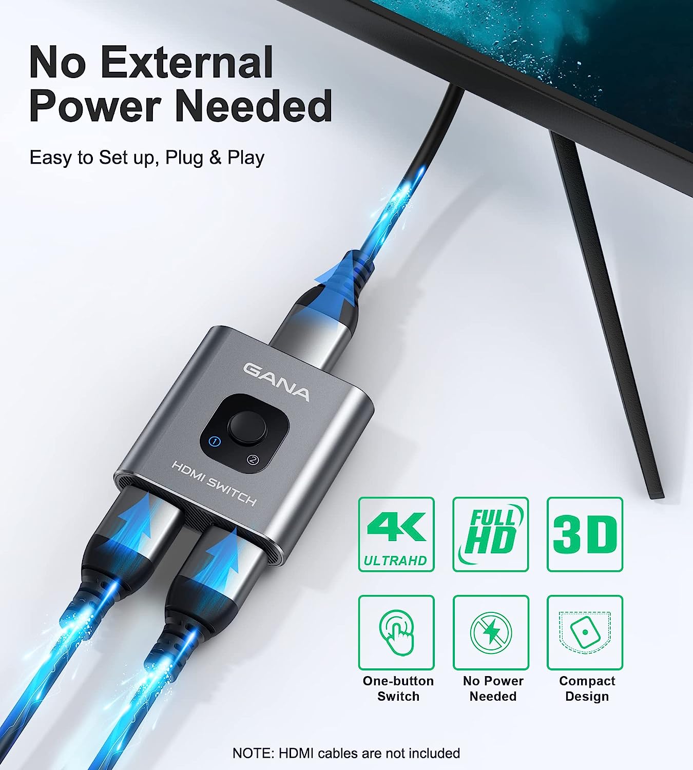 【HDMI Switch bidirektionaler 4K@60Hz】Der HDMI bidirektionale Umschalter ermöglicht es Ihnen, zwei HDMI-Quellen mit einem einzigen HDMI-Display zu verbinden oder zwischen zwei Displays mit einer einzigen HDMI-Quelle umzuschalten. Bitte beachten Sie, dass immer nur ein Display aktiv sein kann.