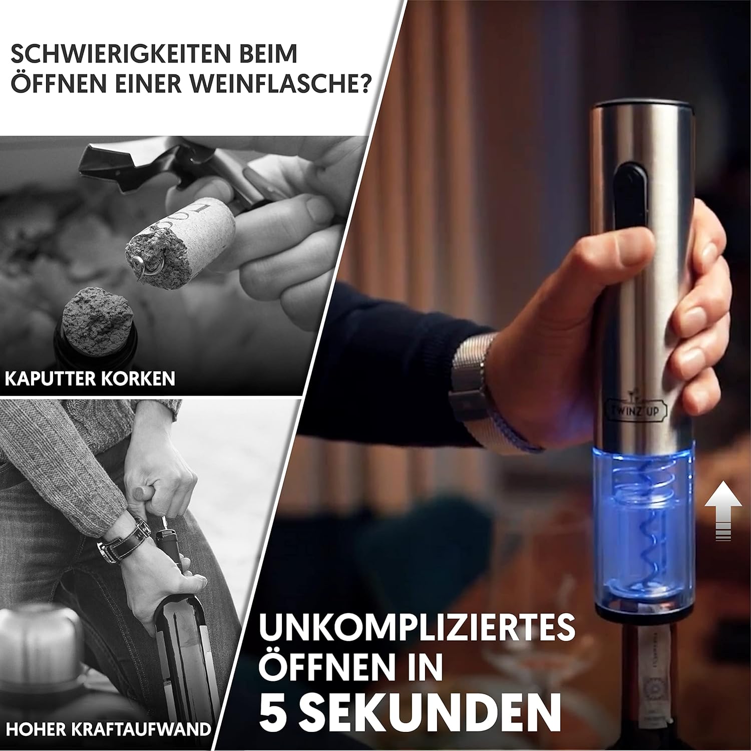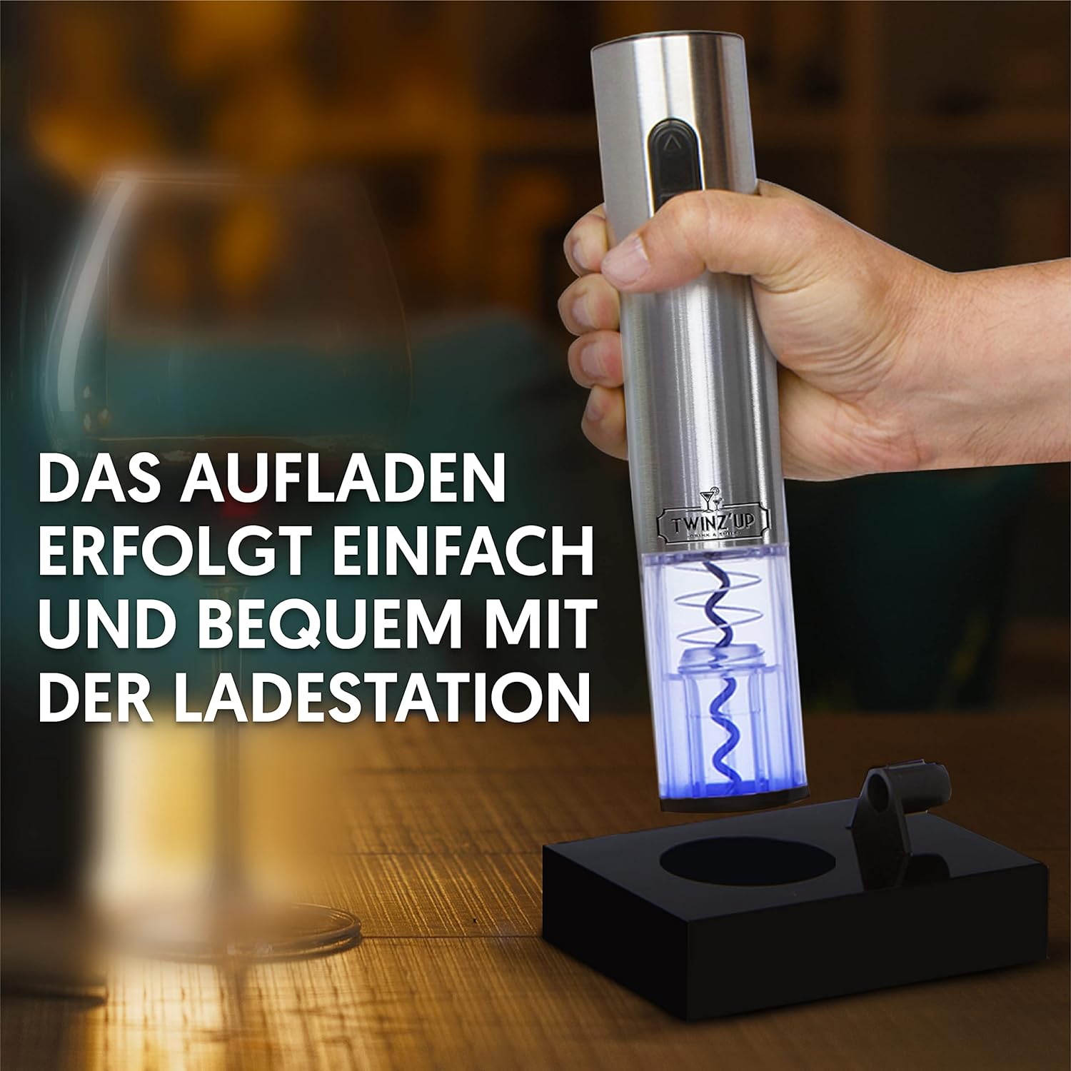 BEEINDRUCKEN SIE IHRE GÄSTE – Mit dem schnurlosen Flaschenöffner von Twinz’up öffnen Sie eine Flasche Wein in nur 8 Sekunden, indem Sie einfach auf einen Knopf drücken. Er leuchtet blau auf, wenn er eingeschaltet ist und der Korken herausgezogen wird. Der Korkenzieher funktioniert mit den meisten Flaschen- und Korkenarten (Kork oder Kunststoff). Das Öffnen Ihrer Flaschen war noch nie so einfach.