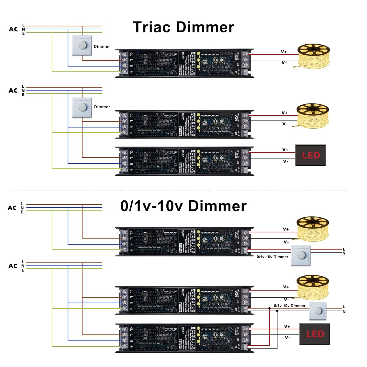 Netzteil 24V Dimmbar - Unterstützt sowohl die TRAIC Dimmung, die 0-10V Dimmung, die 1-10V Dimmung und PWM. Hinweis: Für maximale Dimmwirkung und Leistung laden Sie den Treiber auf mindestens 70% seiner Kapazität.