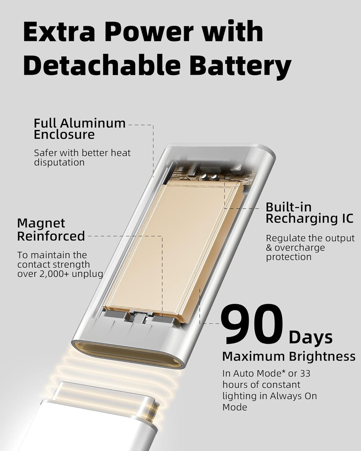 - 【Hohe Kapazität und abnehmbare Batterie】 Die 1500mAh wiederaufladbare Batterie kann 2 Monate im Auto-Modus (6 mal pro Tag) oder bis zu 33 Stunden konstante Beleuchtung dauern. Es hat auch ein abnehmbares Design, das das Aufladen viel bequemer macht.