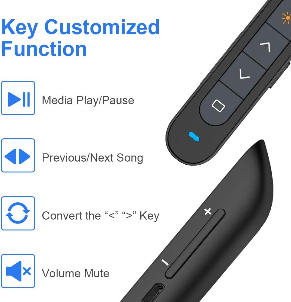 【300 ft lange Kontrollreichweite und helles rotes Licht】①Arbeitet mit einer 2,4-G-HF-Frequenz mit einer Reichweite von bis zu 300 Fuß, die beste Wahl für große Anlässe. ②Präsentations-Presenter erzeugt ein helles rotes Licht, das auf den meisten Hintergründen gut zu erkennen ist (nicht empfohlen für LED- / LCD- / TV-Bildschirme).