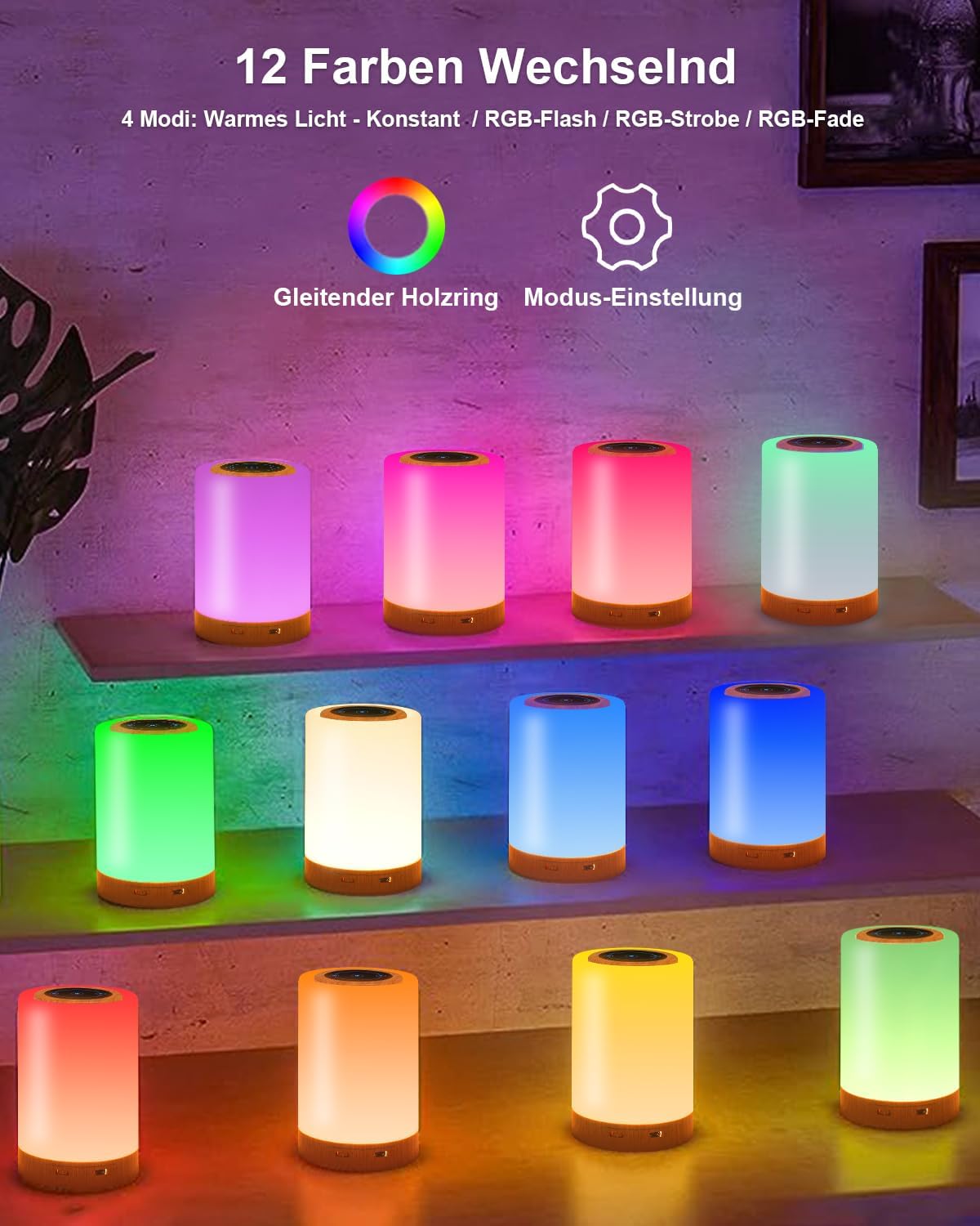 Stimmungslicht mit 12 RGB Farben und 4 Modi, Schlafzimmer Tischlampe Kabellos, Warmweiß LED Nachtlicht mit Timer, Deko Nachtlampe für Kinderzimmer und Camping [Energieklasse G]
