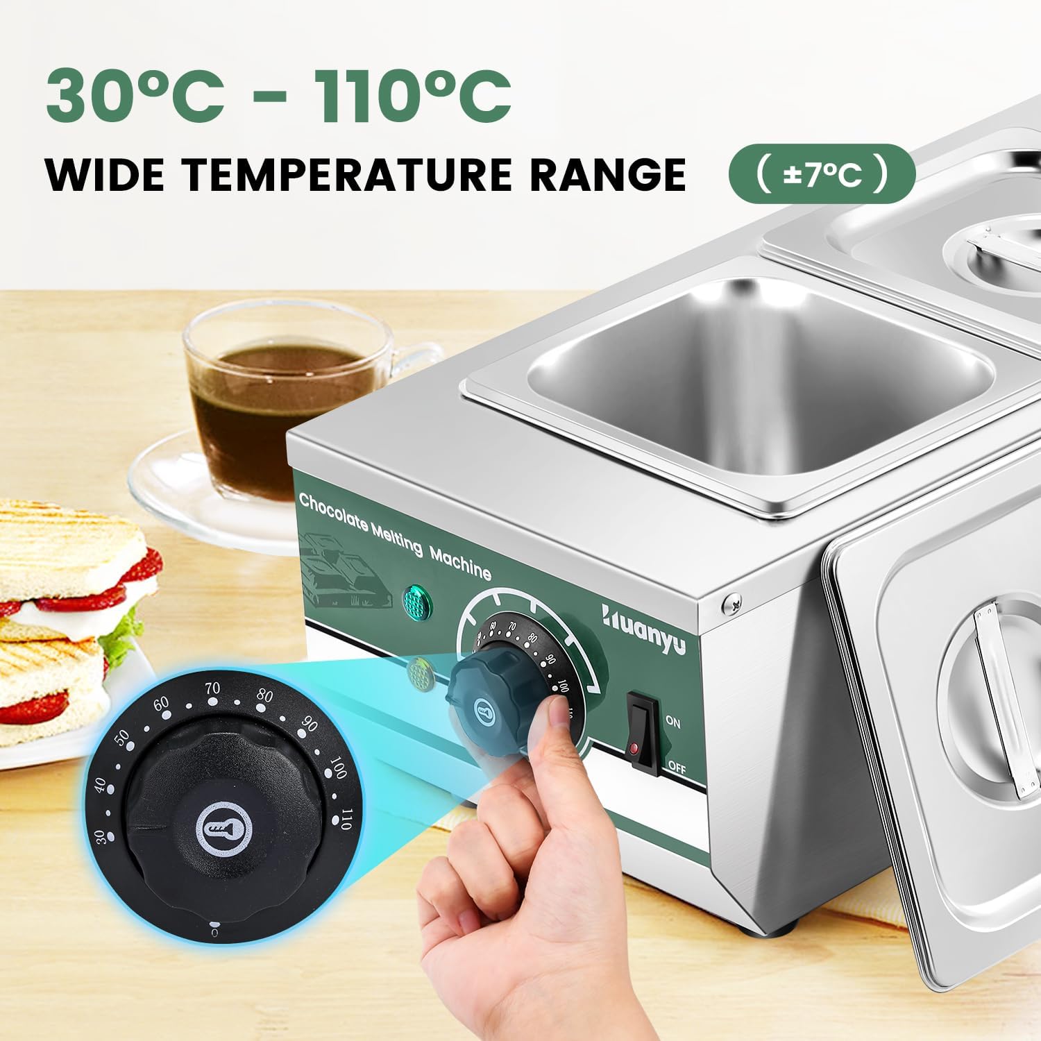 【Mit 2*1.5L Schmelztopf】Die Schokoladen-Temperiermaschine hat zwei 1.5L Kapazität Schmelztöpfe, die bequem für Sie ist, um zwei verschiedene Schokolade oder anderes Material zur gleichen Zeit zu erhitzen! Beide Töpfe sind mit staubdichten Abdeckungen ausgestattet, die den Wärmeerhaltungseffekt verbessern und die Lebensmittel sauber und hygienisch halten.