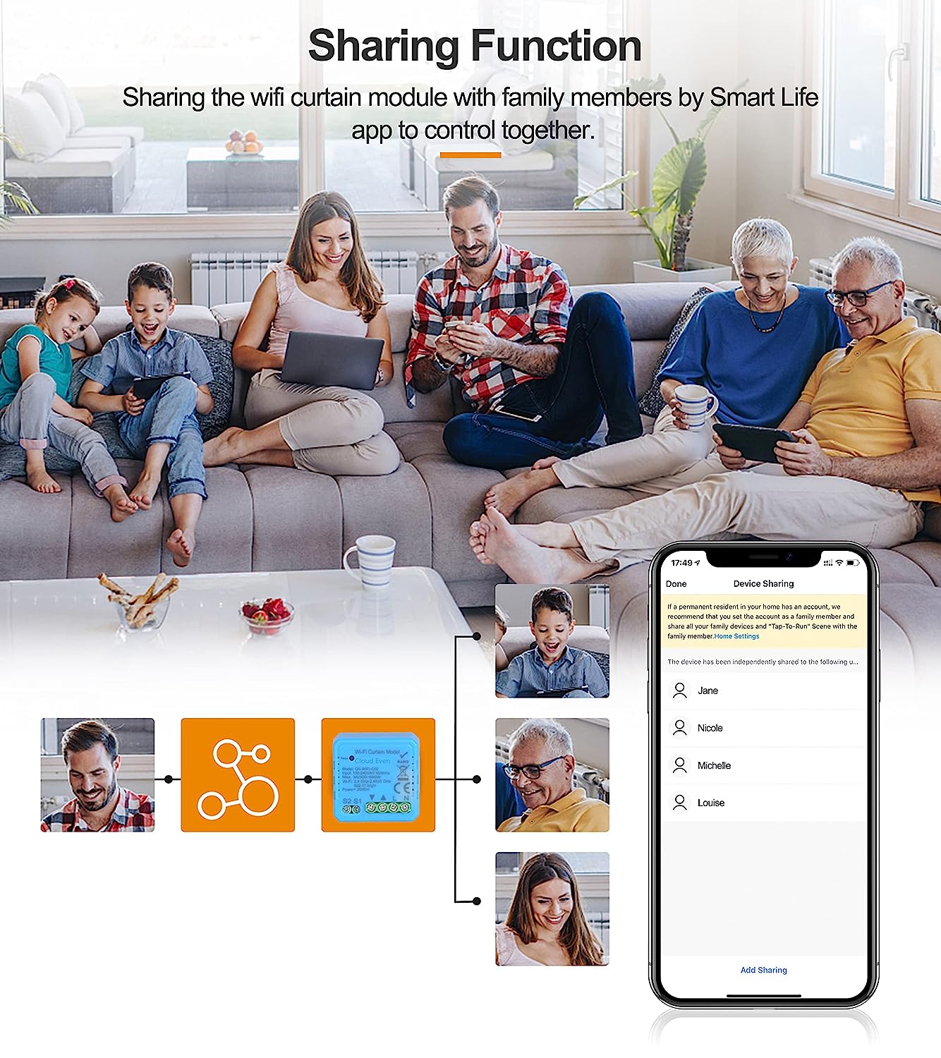 Gemeinsames Gerät: Dieser intelligente Schalter kann mehrere Kontrollstellen haben, die von verschiedenen Familienmitgliedern geteilt werden. Ein Telefon kann auch mehrere Schalter steuern. Timer einstellen: Sie können ein Programm zum Öffnen oder Schließen des Vorhangs einstellen.